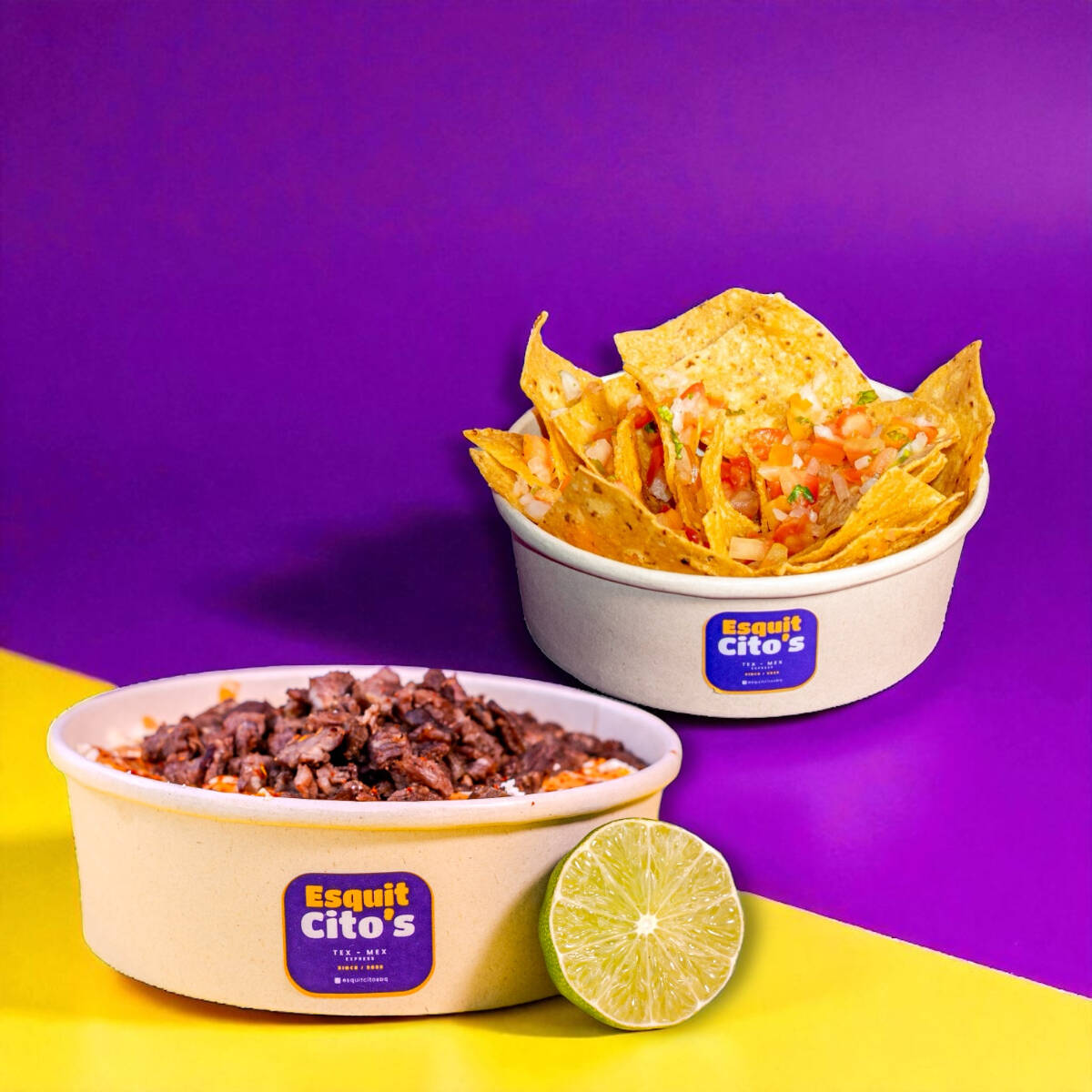 Bowl de maíz, trocitos de carne y pollo a la parrilla, Tajín, limón, queso costeño, chipotle y salsa de la casa + Crujientes nachos de maíz frito acompañado con pico de gallo, guacamole y sour cream.