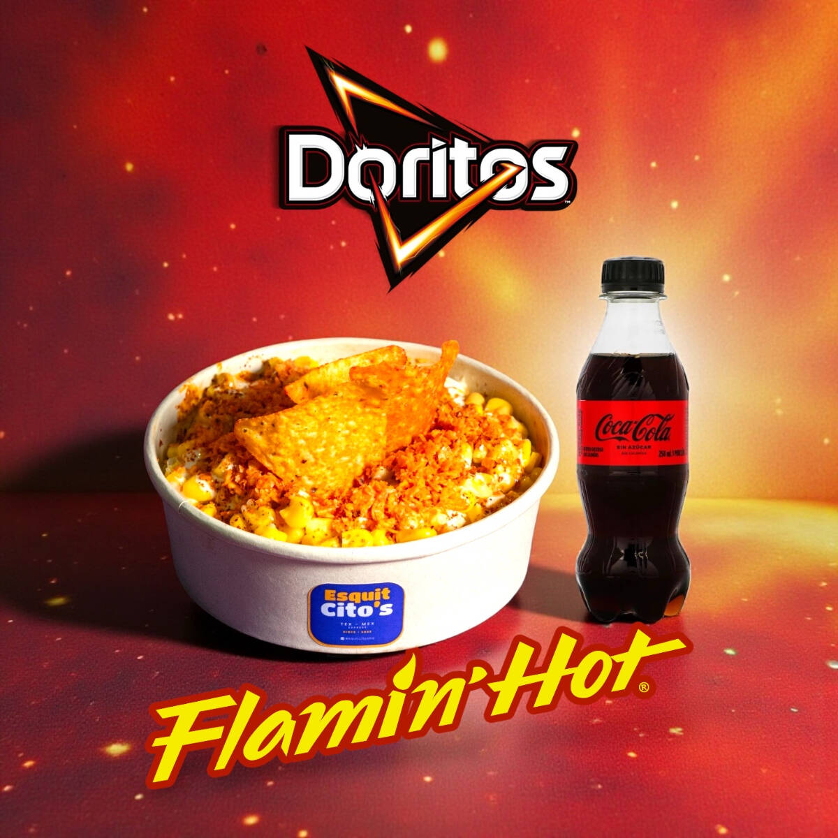 Esquite flamin hot gratinado de 16 oz y coca colas zero 250 ml.
