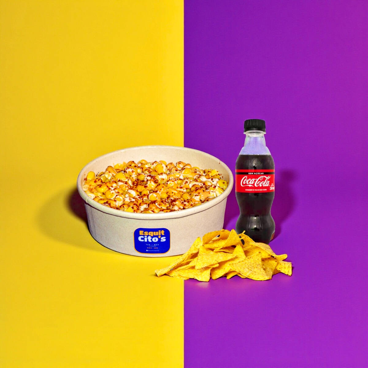 Bowl de 26 oz de maíz tierno, tajín, limón, queso costeño, chipotle, queso mozzarella, salsa de la casa y 2 coca cola