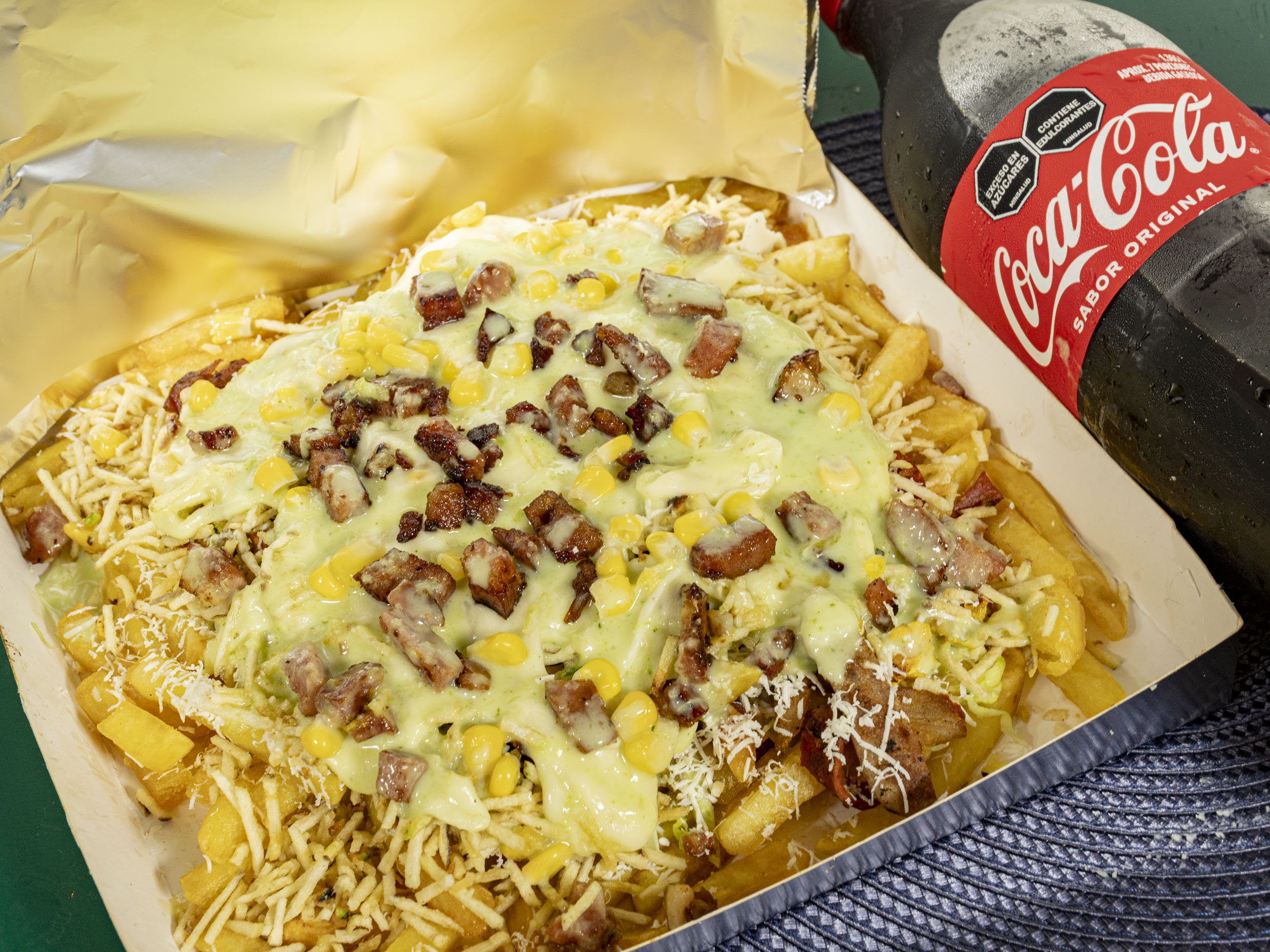 (Porcion grande para dos o tres personas) Trozos de salchicha de cerdo,+ queso + salsas +Papas a la Francesa + Bebida mediana