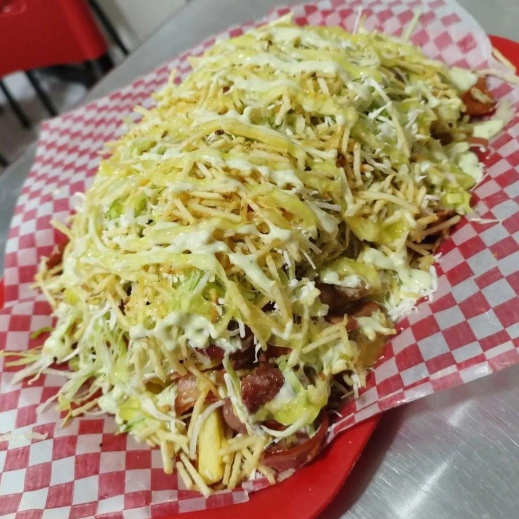 Trae: Papas Fritas, Tocineta, Mozarrella, Maiz, Pechuga en Trozo, Chorizo, Butifarra, Salchicha, Chongo, Lechuga.