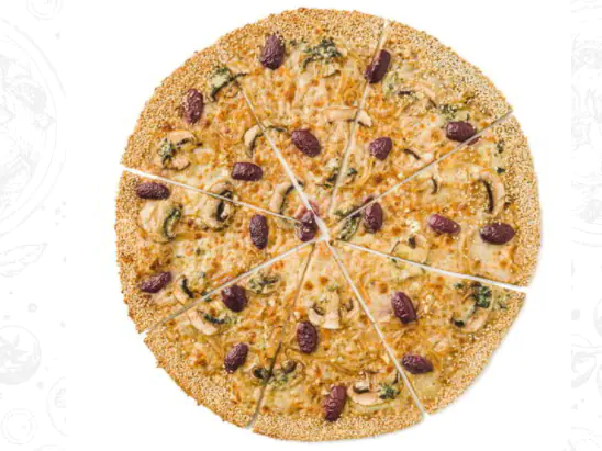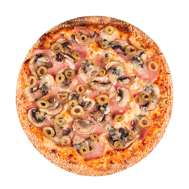 Queso mozzarella, champiñones frescos, ajo, queso azul, cebolla caramelizada, aceitunas negras, albahaca, orégano y ajonjolí en el borde.