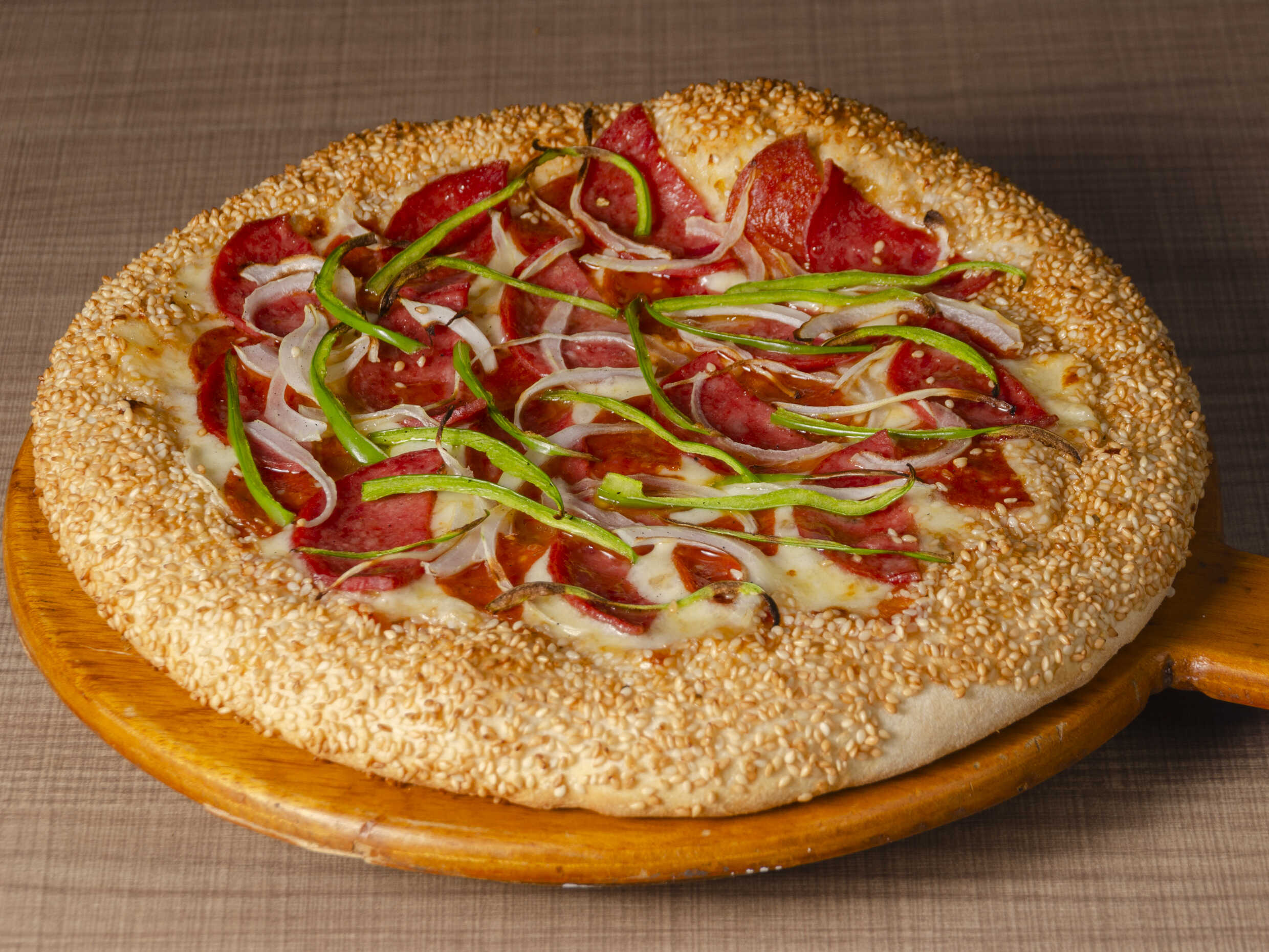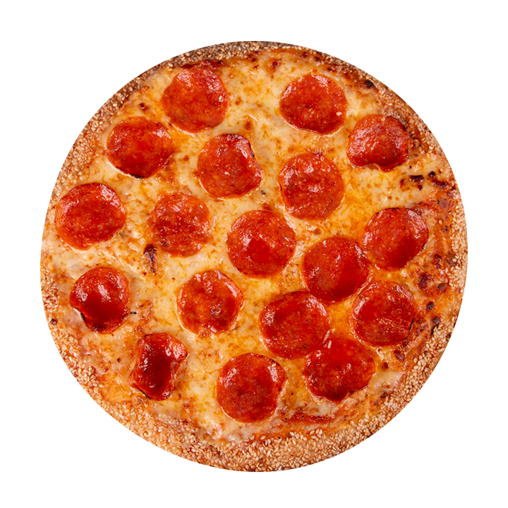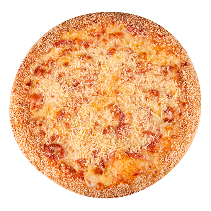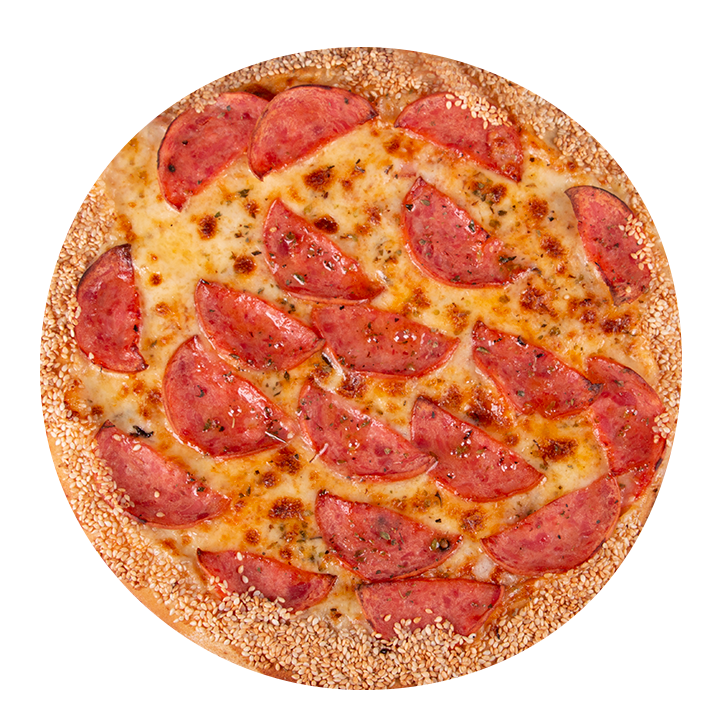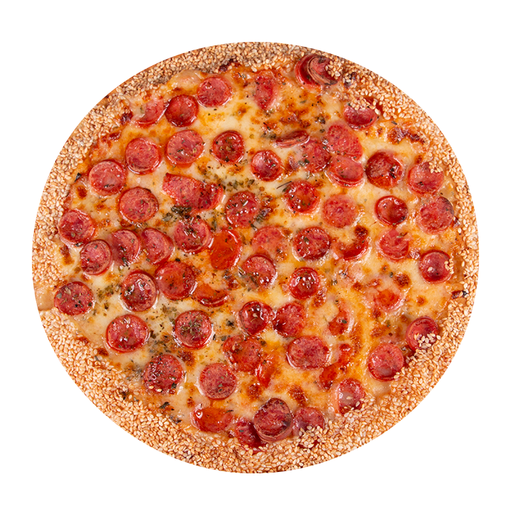 Queso mozzarella, pepperoni americano, albahaca, orégano y ajonjolí en el borde.