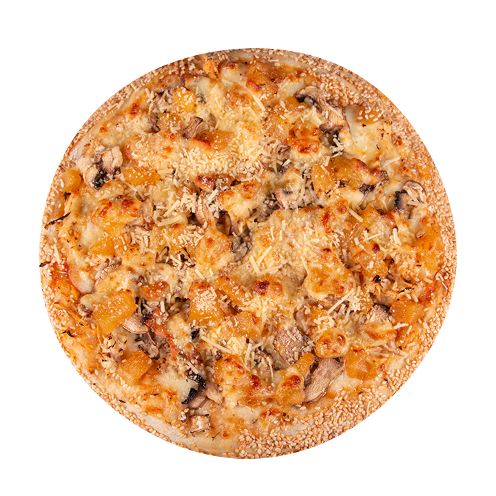 Queso mozzarella, queso parmesano, queso gouda, pollo, champiñones frescos, conserva de piña elaborada en casa, ajo, albahaca, orégano y ajonjolí en el borde.