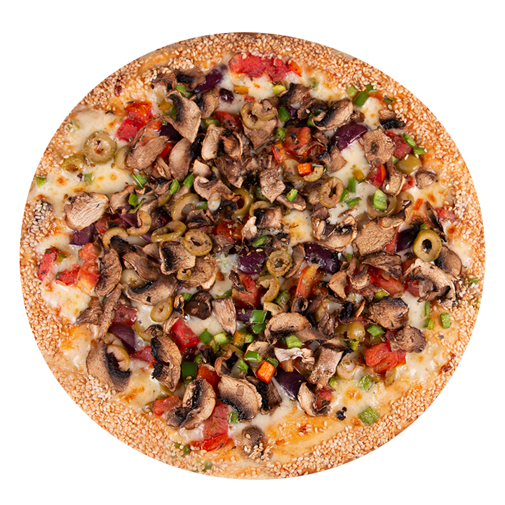 Queso mozzarella, champiñon, pimentón, tomate, ajo, cebolla, aceitunas negras, aceitunas verde, albahaca, orégano y ajonjolí en el borde.