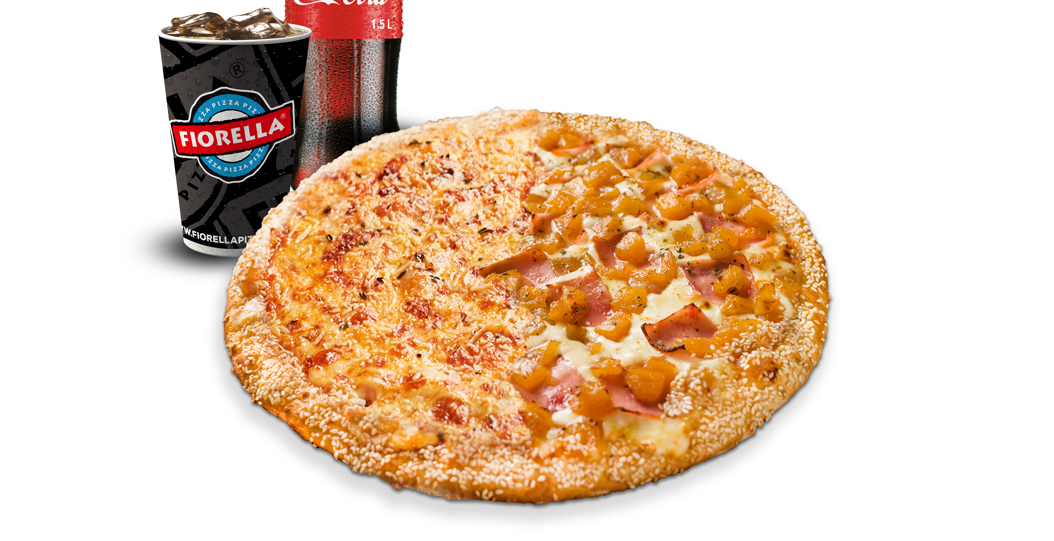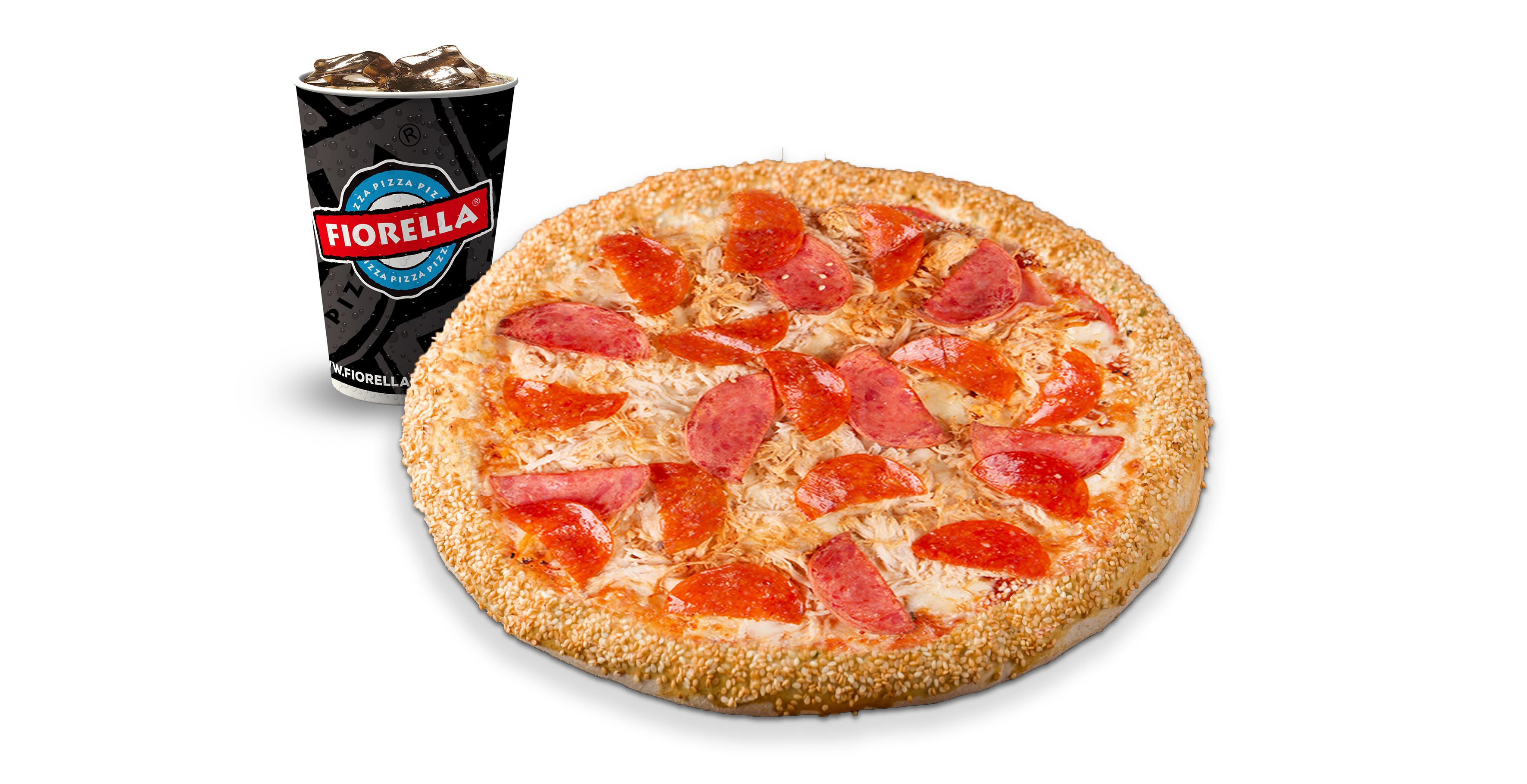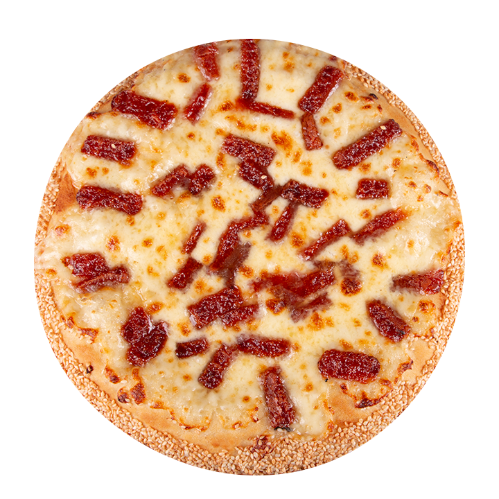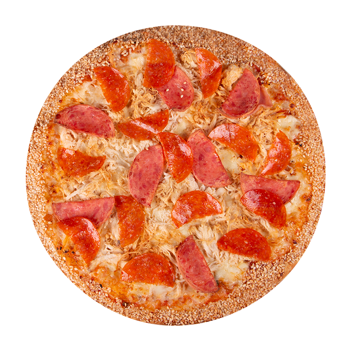 Queso mozzarella, pollo, salami, pepperoni americano, albahaca, orégano y ajonjolí en el borde.