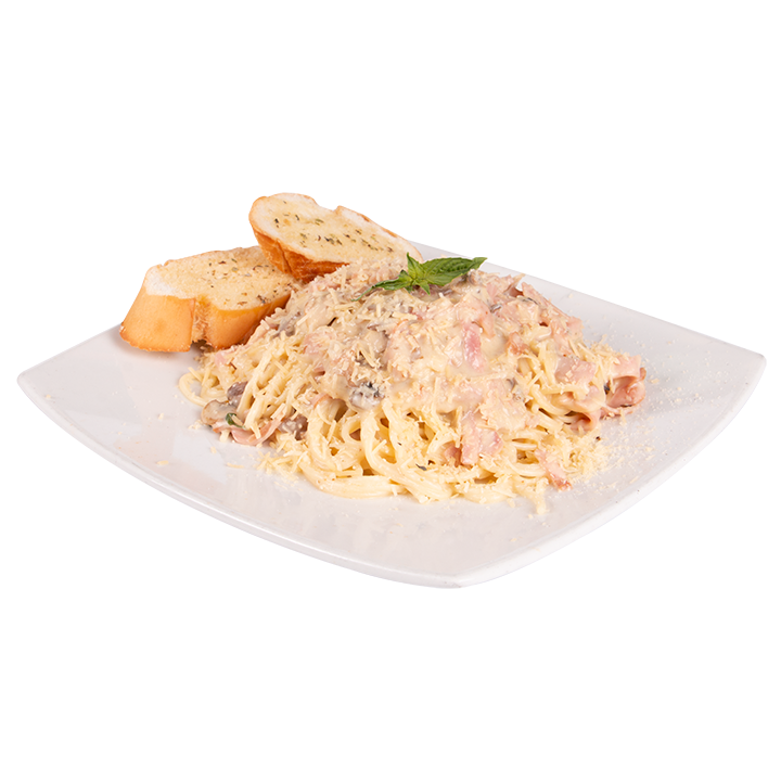 Pasta envuelta en salsa carbonara a base de bechamel con tocineta, champiñones, queso mozzarella y parmesano. Acompañada de pan tostado y bebida (sabor sujeto a disponibilidad)