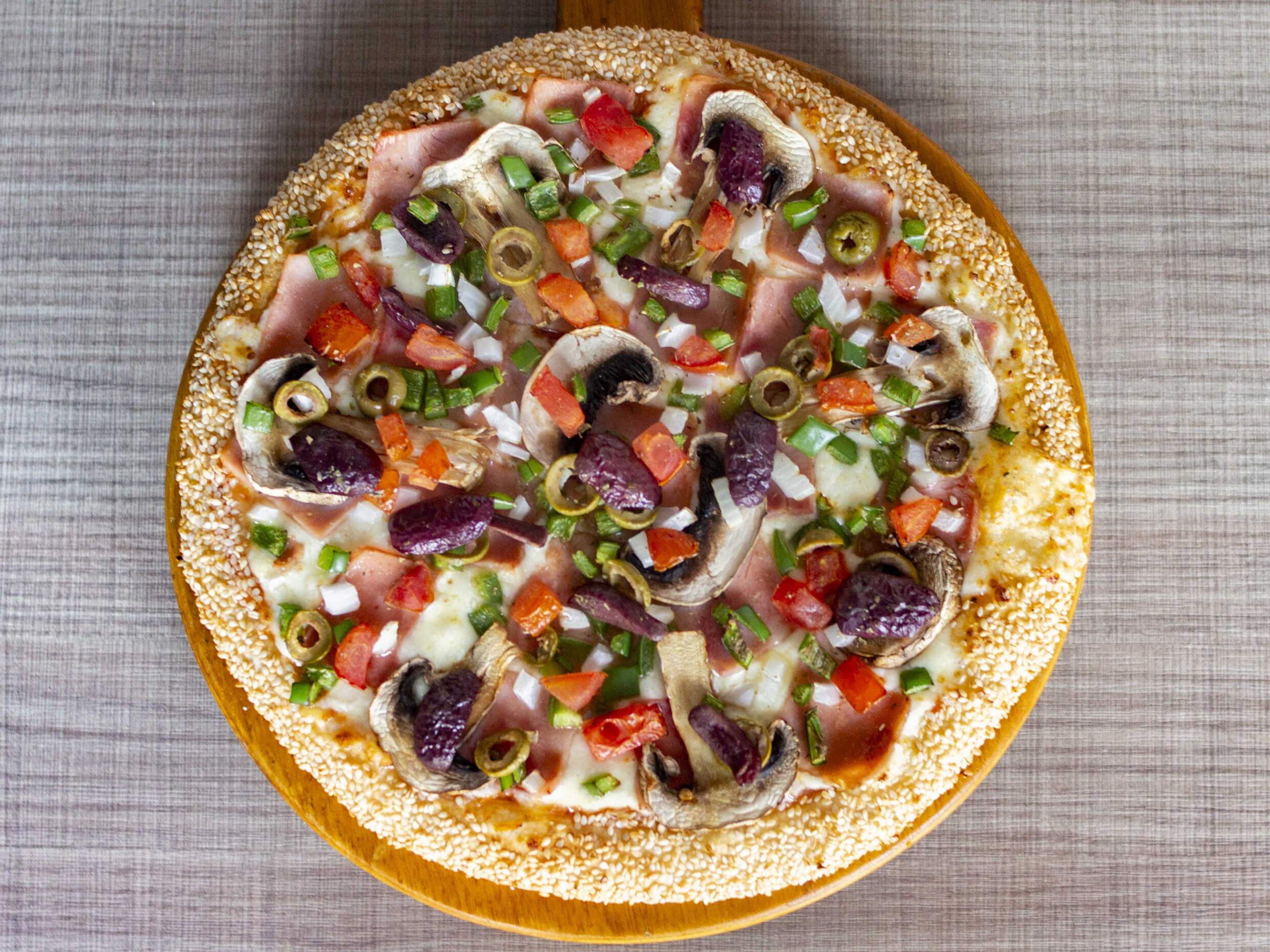 Queso mozzarella, jamón Pietrán, champiñón, pimentón, tomate, ajo, cebolla, aceitunas negras, aceitunas verdes, albahaca, orégano y ajonjolí en el borde.