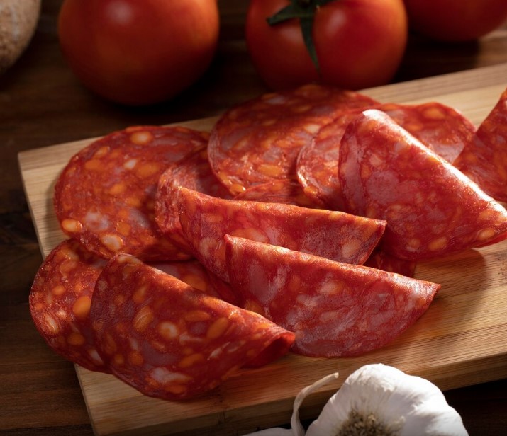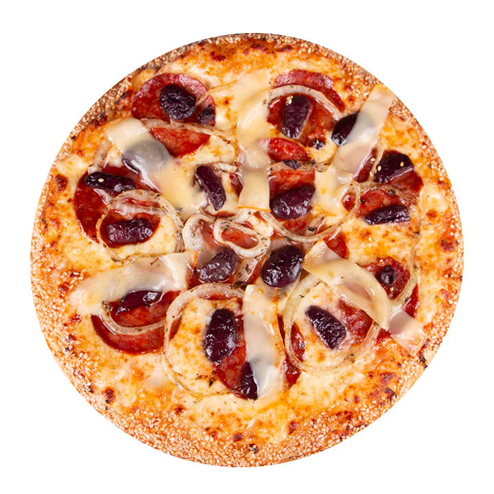 Chorizo español, queso munster, anillos de cebolla gourmet, aceitunas negras, albahaca, orégano y ajonjolí en el borde.