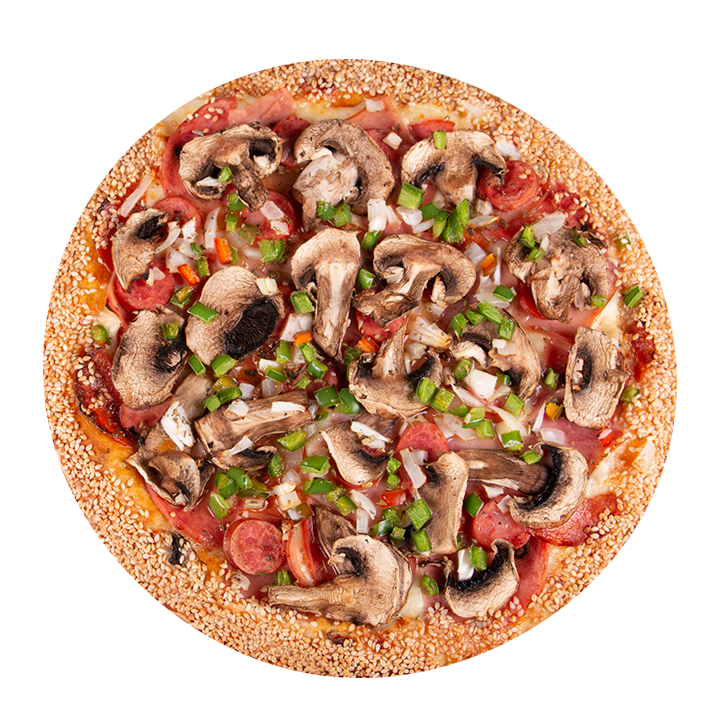 Queso mozzarella, jamón, salami, pepperoni americano, pepperoni nacional, champiñon, pimentón, cebolla, albahaca, orégano y ajonjolí en el borde.