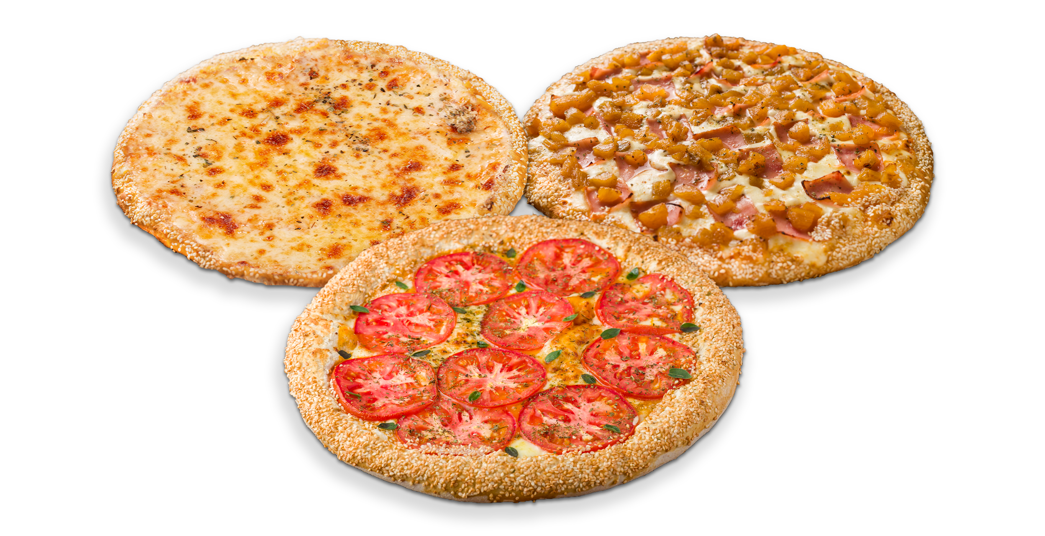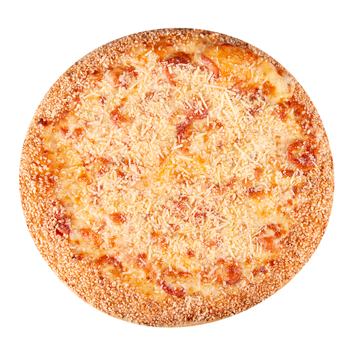 Salsa napolitana, queso mozzarella, albahaca, orégano y ajonjolí en el borde.