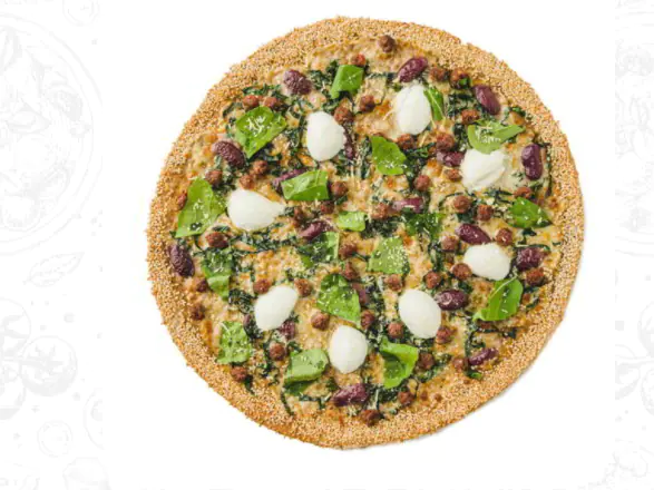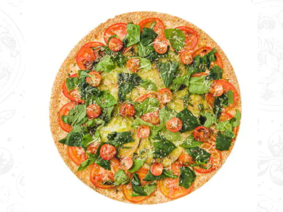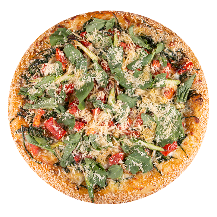 Queso mozzarellaRúgula, espárragos, espinaca, lechuga romana, tomate, cebolla, queso parmesano, queso azul, salsa pesto, aceite de oliva, albahaca, orégano y ajonjolí en el borde.