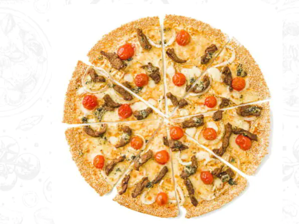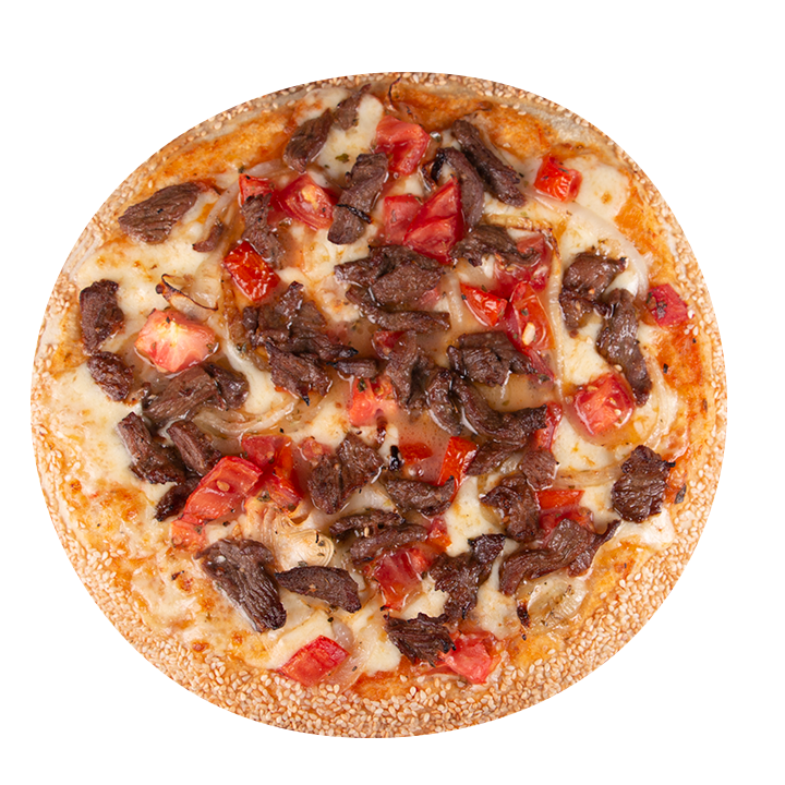 Queso mozzarella, laminas de lomo de res, queso azul, ajo, tomate cherry, cebolla gourmet, albahaca, orégano y ajonjolí en el borde.
