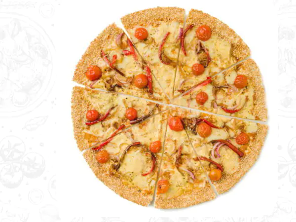 Queso mozzarella, queso gouda, queso parmesano, pimentones confitados, cebolla al vino, tomate cherry, cebolla caramelizada, albahaca, orégano y ajonjolí en el borde.