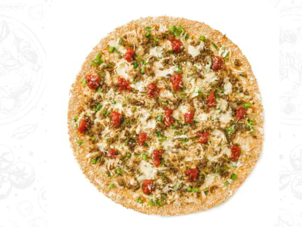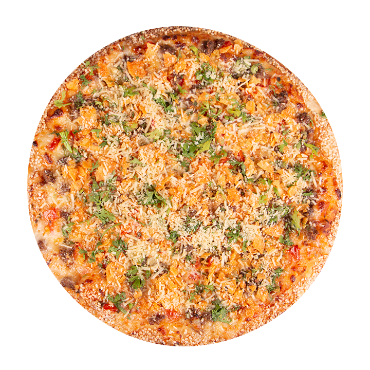 Queso mozzarella, frijol refrito, carne molida, tomate picado, jalapeños, cilantro, nachos, albahaca, orégano y ajonjolí en el borde.