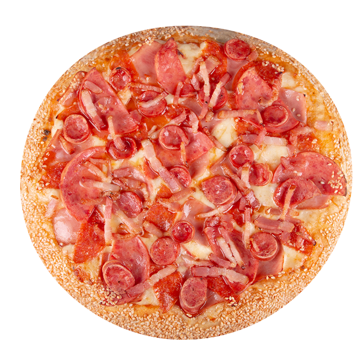 Queso mozzarella, tocineta, jamón, salami, pepperoni americano, pepperoni nacional, albahaca, orégano y ajonjolí en el borde.