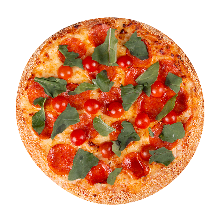 Queso mozzarella, pepperoni americano, rúgula, tomate cherry, albahaca, orégano y ajonjolí en el borde.