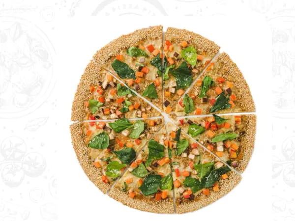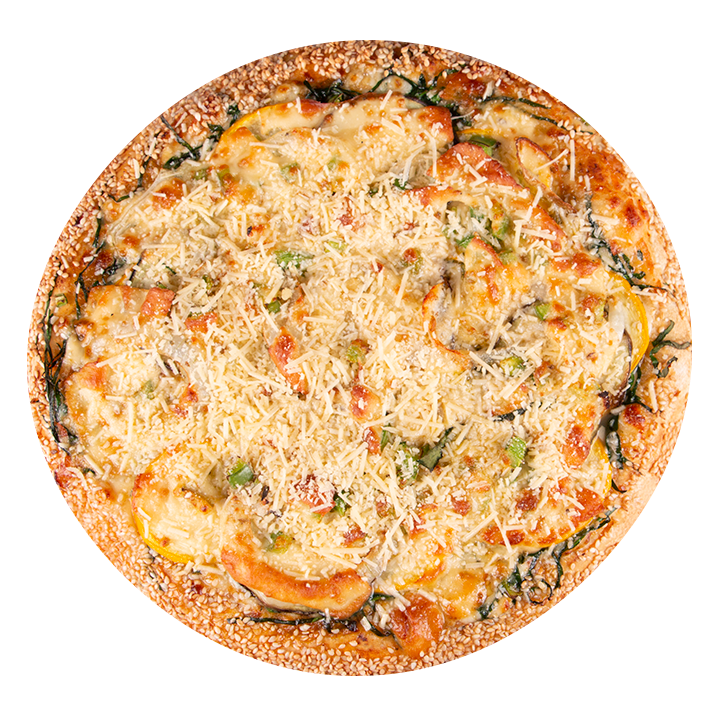 Queso mozzarella, berenjena, zucchini, cebolla gourmet, pimentón, salsa pesto, queso gouda, queso parmesano, espinaca, albahaca, orégano y ajonjolí en el borde.