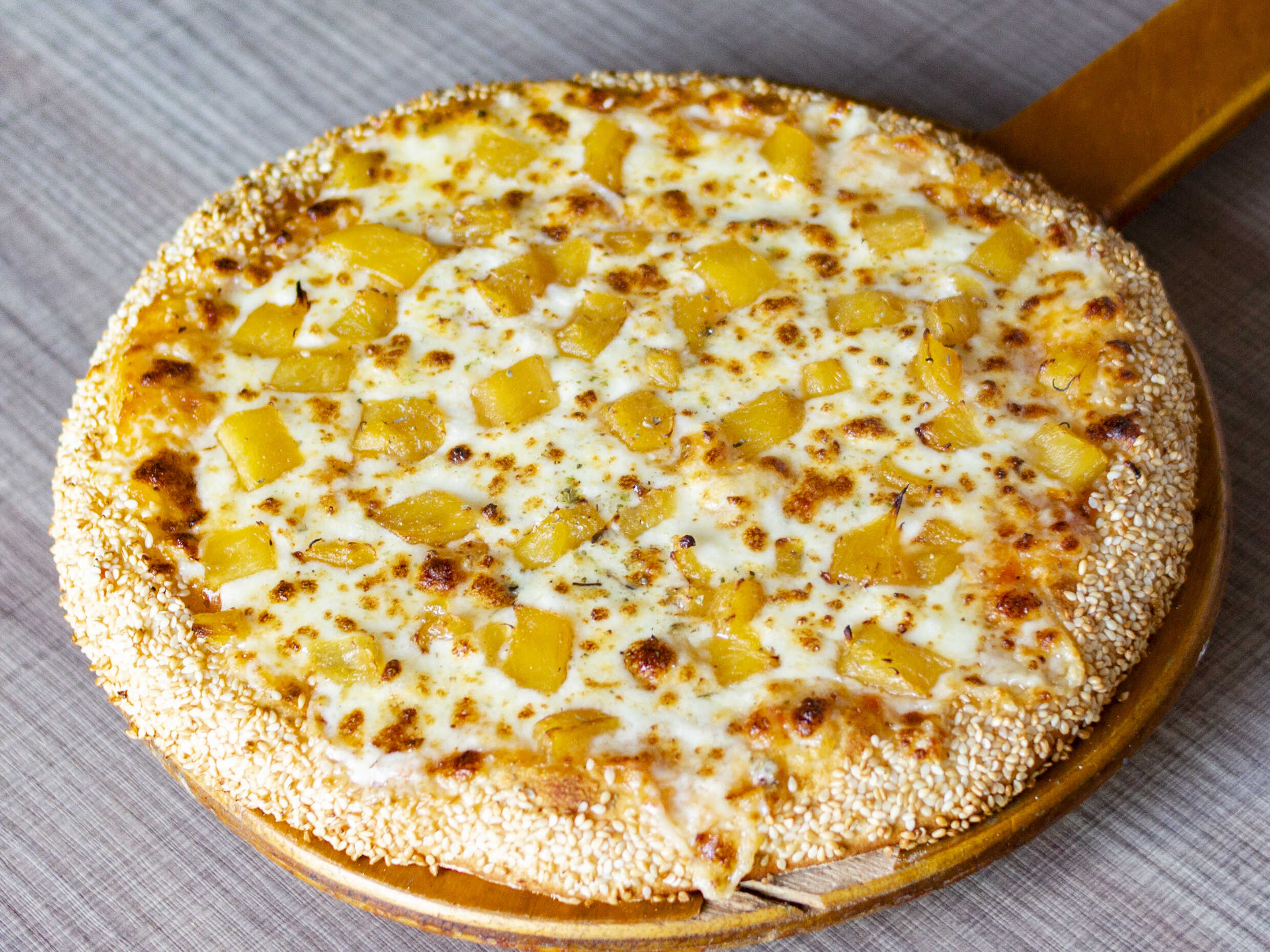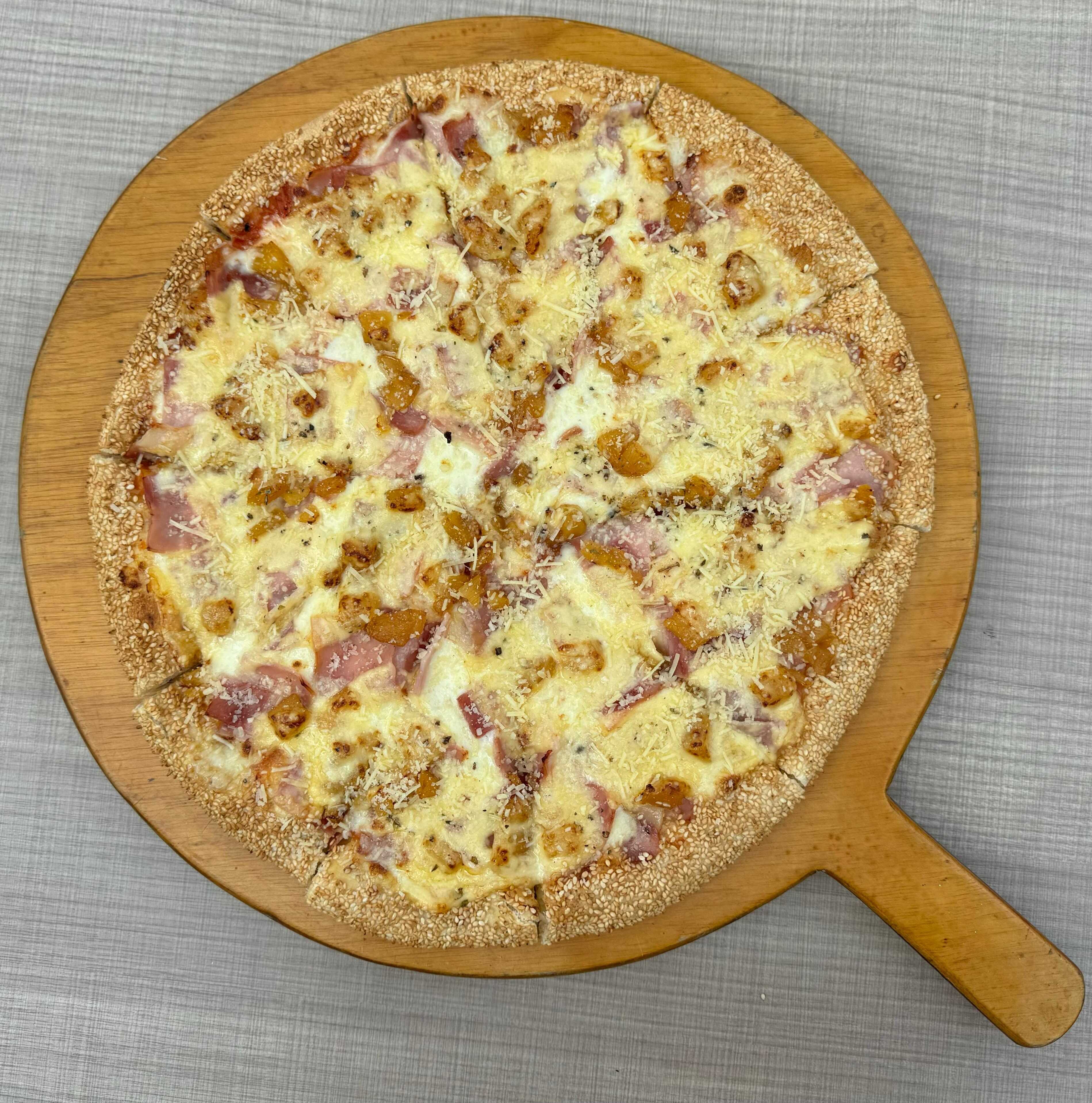 Queso mozzarella, jamón Pietrán, conserva de piña elaborada en casa, albahaca, orégano y ajonjolí en el borde.