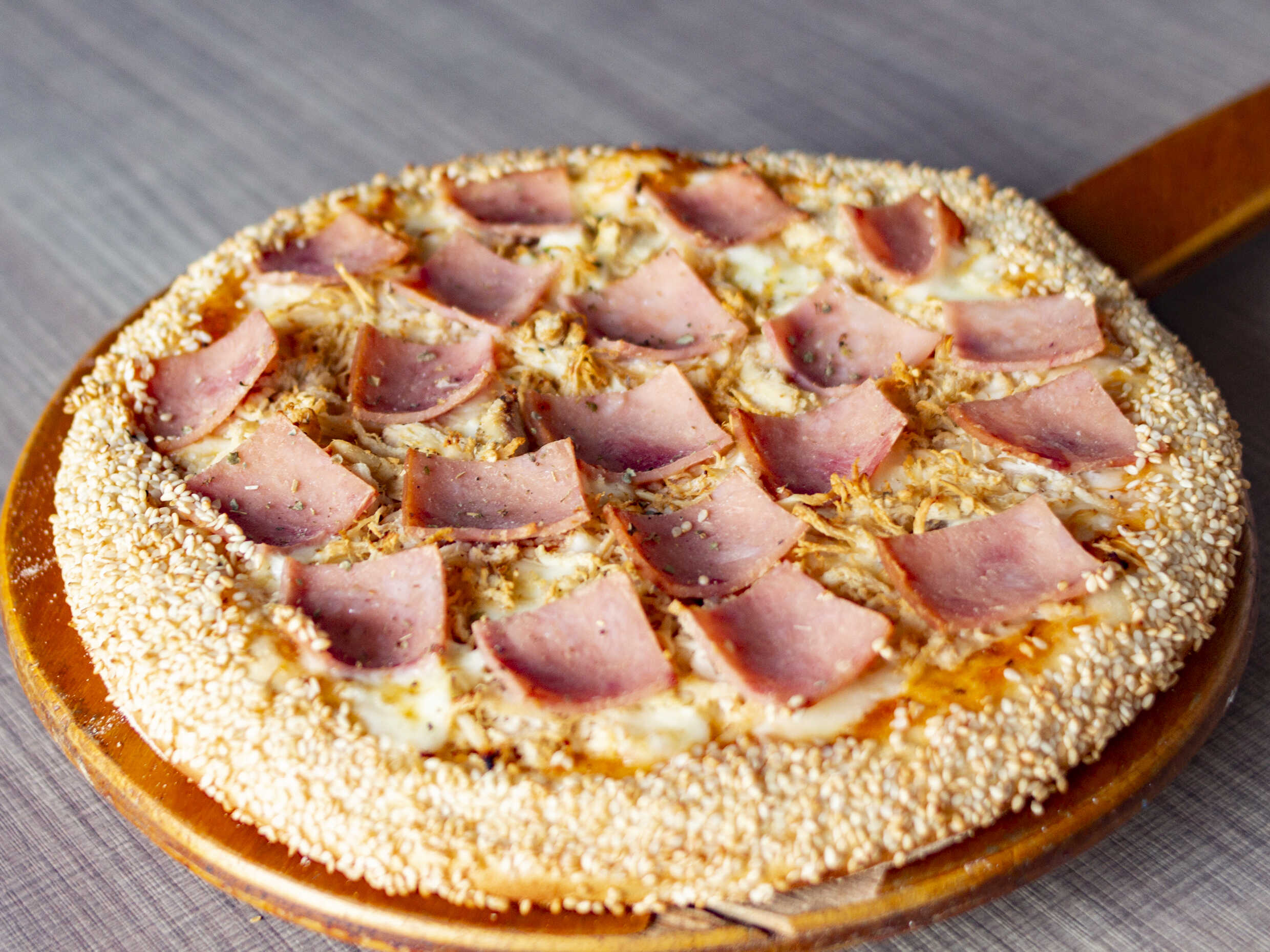 Queso mozzarella, pollo, jamón Pietrán, albahaca, orégano y ajonjolí en el borde.