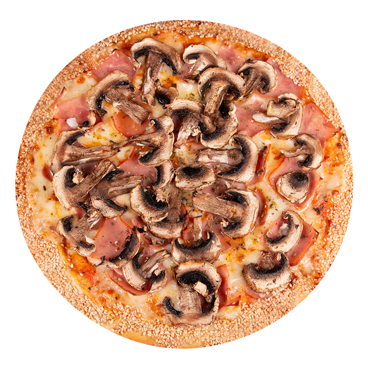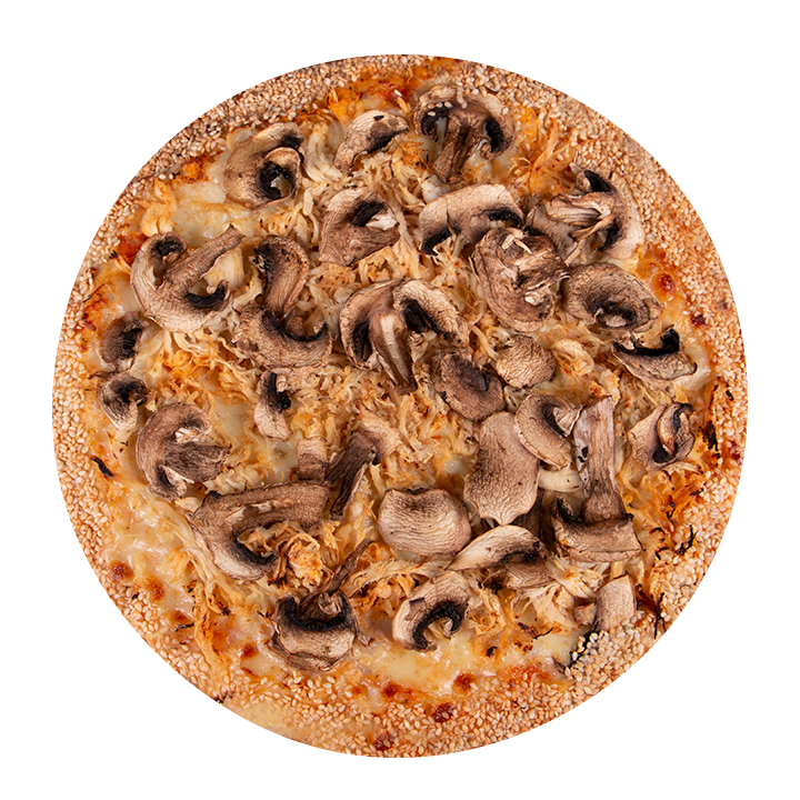 Queso mozzarella, queso parmesano, queso gouda, pollo, champiñones frescos, albahaca, orégano y ajonjolí en el borde.