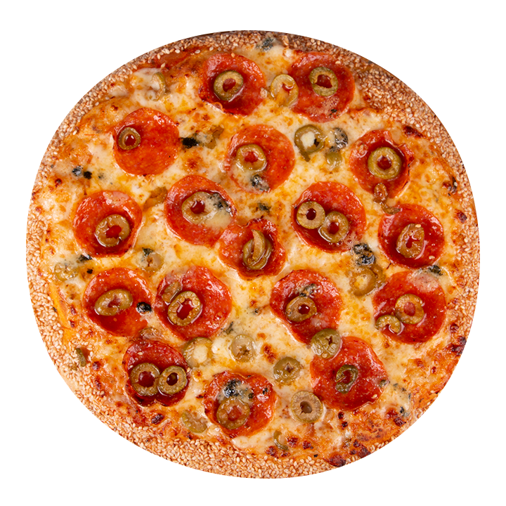 Queso mozzarella, queso azul, pepperoni americano, aceitunas verdes, ajo, albahaca, orégano y ajonjolí en el borde.