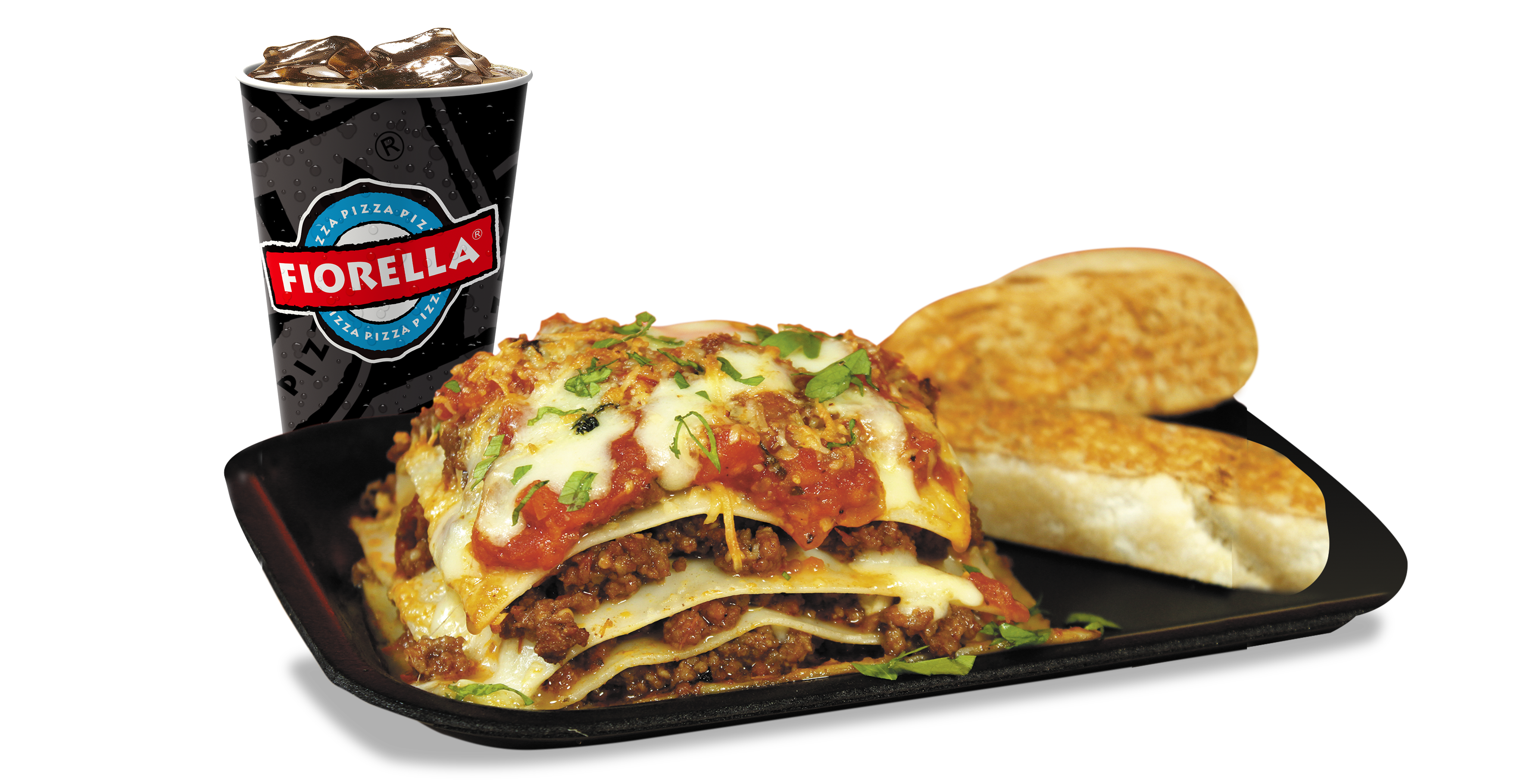 Lasagna en salsa a elección, acompañada de pan tostado y bebida.