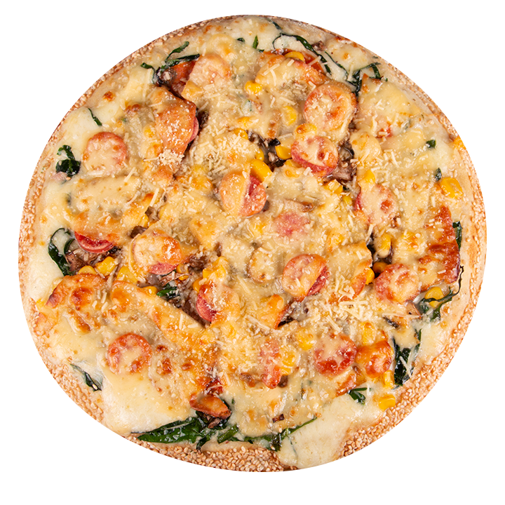 Queso mozzarella, chorizo español, kábano, champiñones, salsa bechamel, maíz, espinaca, queso gouda, queso parmesano, albahaca, orégano y ajonjolí en el borde.