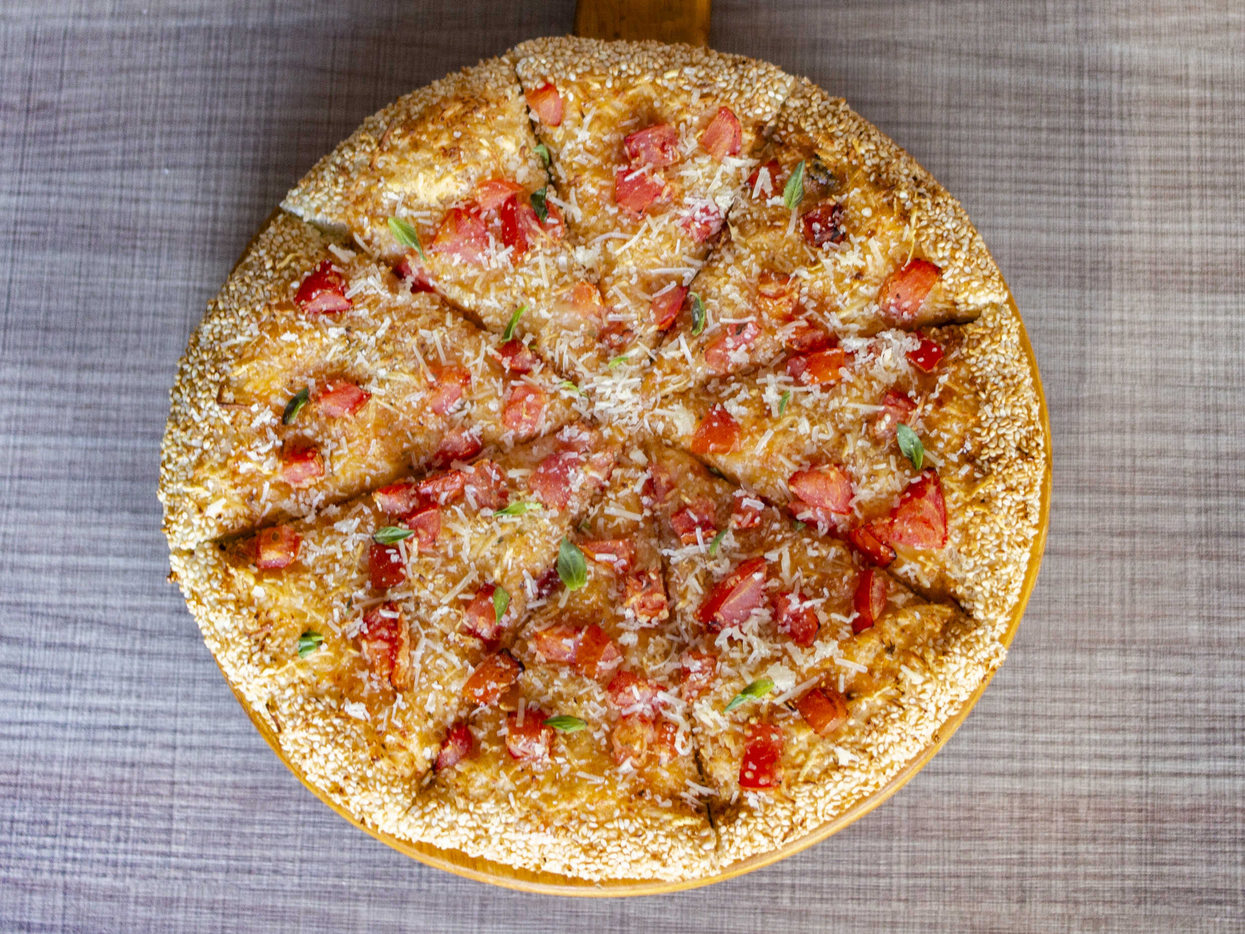 Salsa napolitana, queso mozzarella, albahaca, orégano y ajonjolí en el borde.