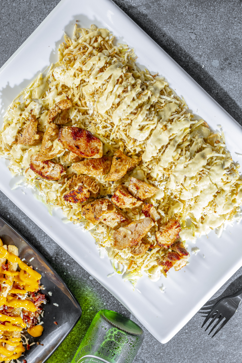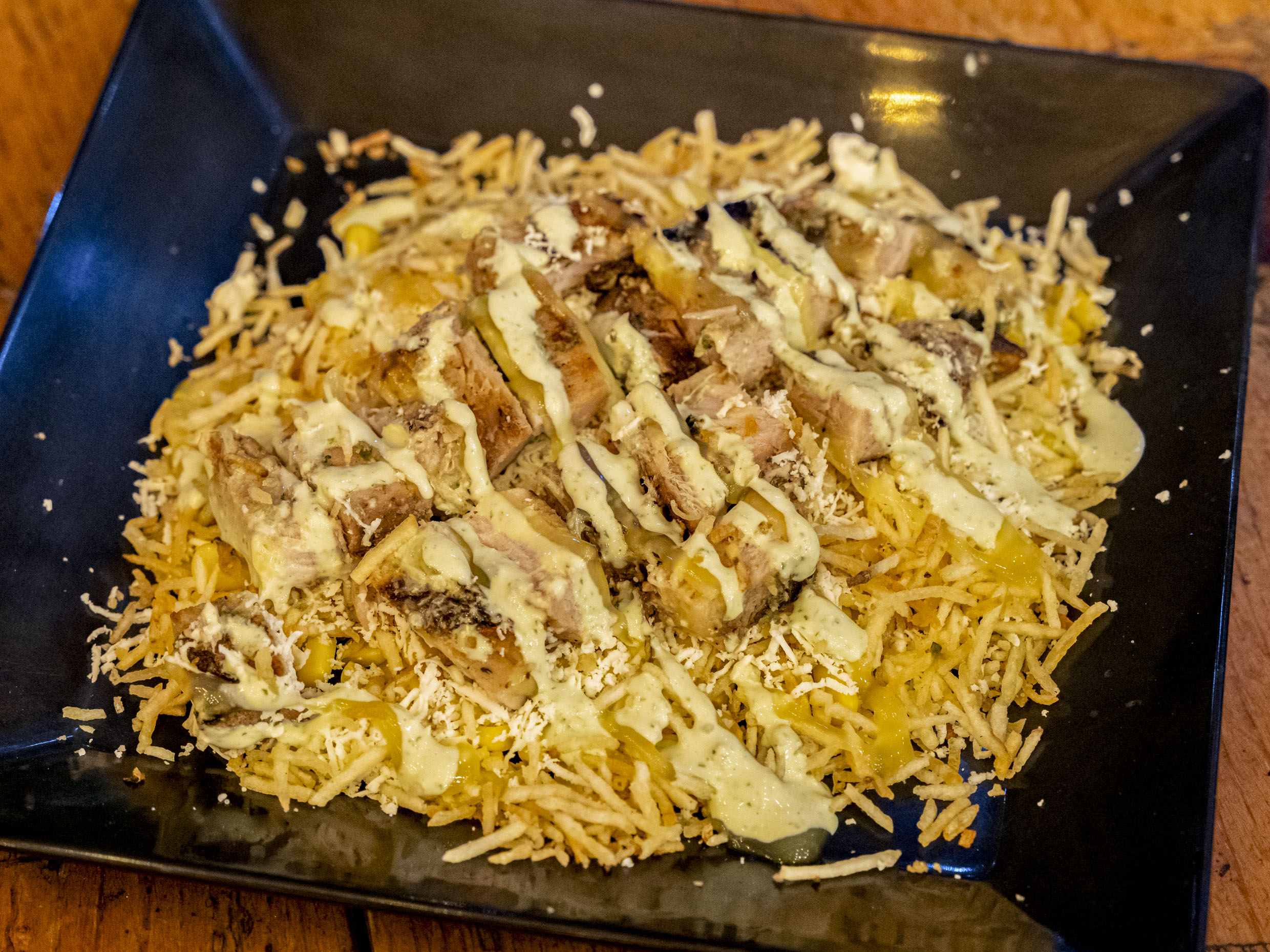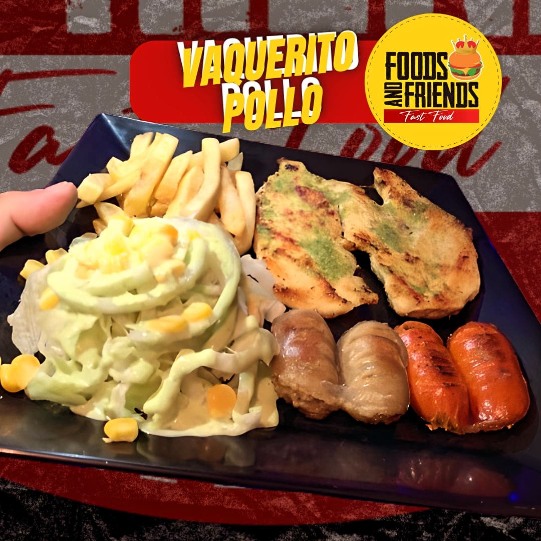Papas a la francesa, pollo, queso costeño, lechuga batavia, papa chongo.