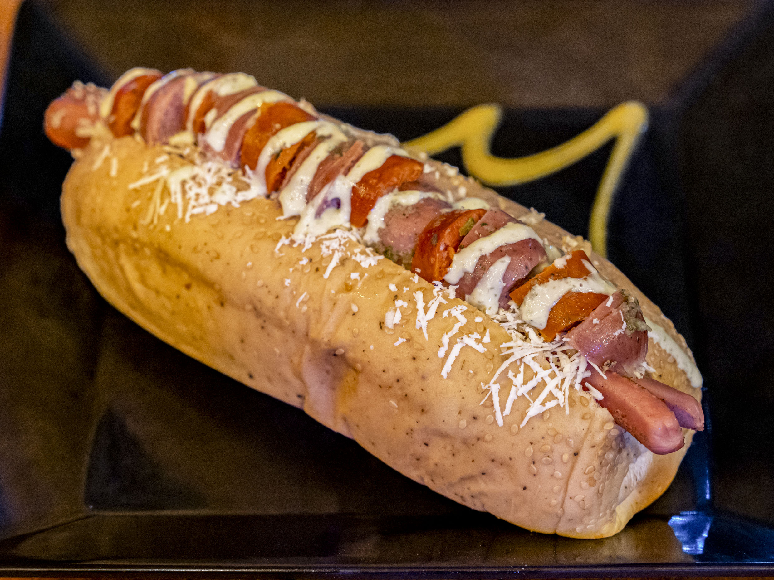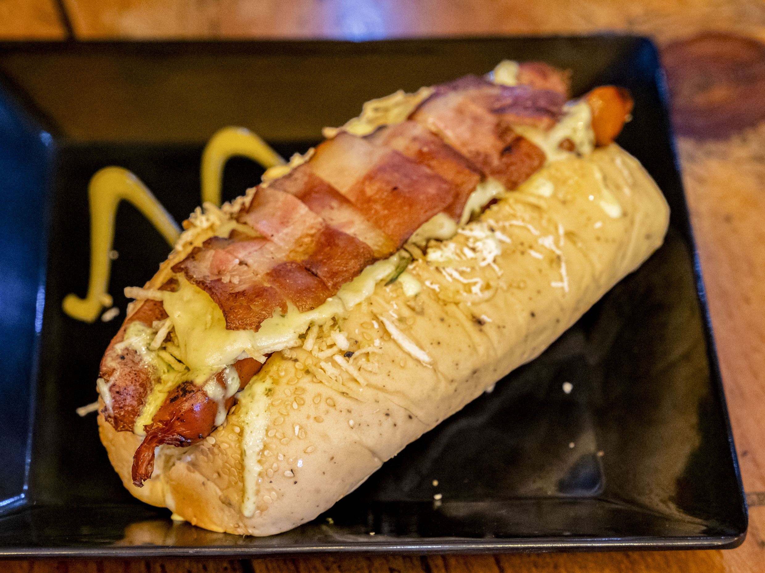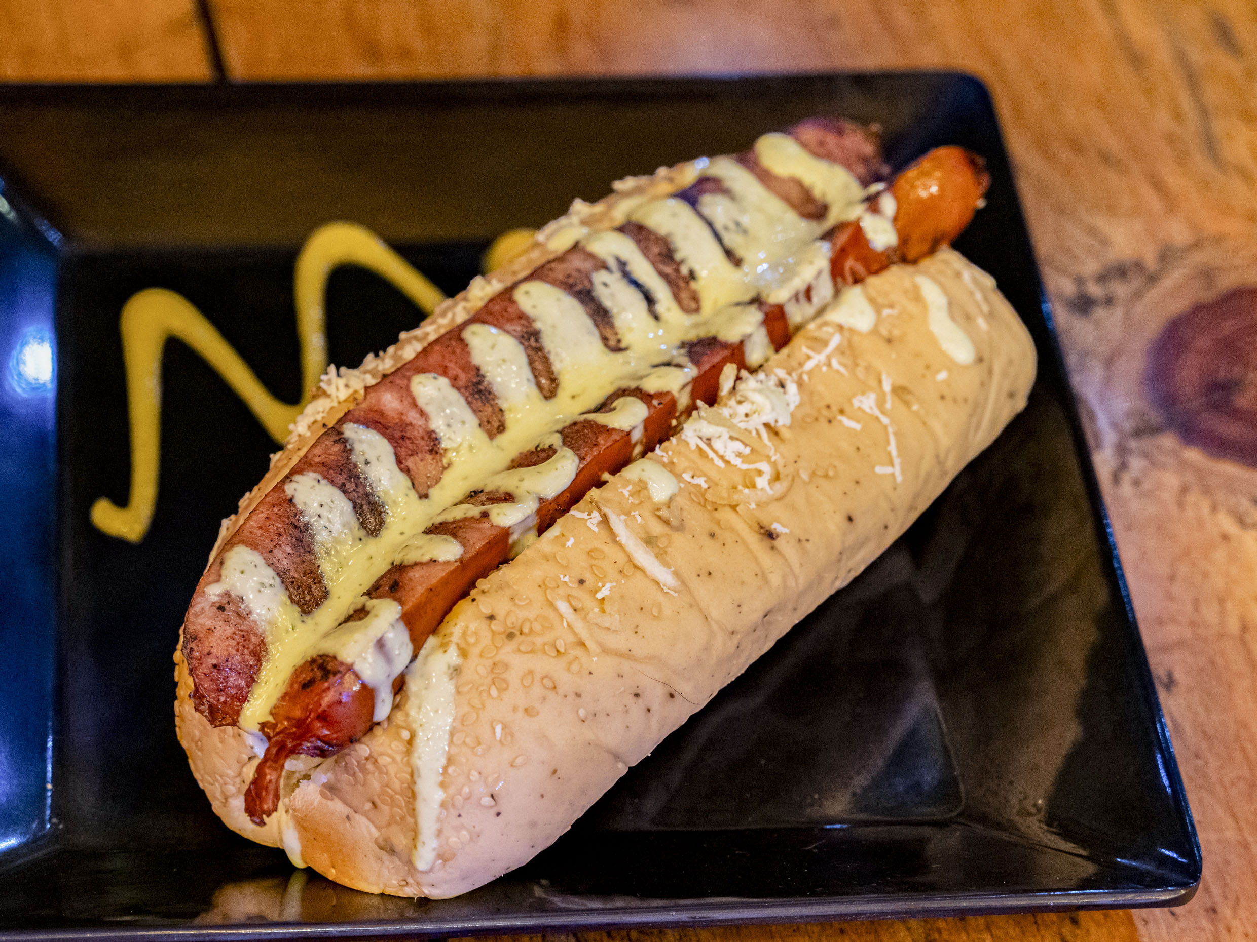 Pan artesanal, doble salchicha, queso costeño, papa chongo, salsa tártara.