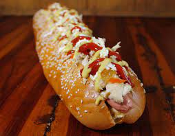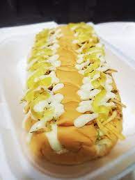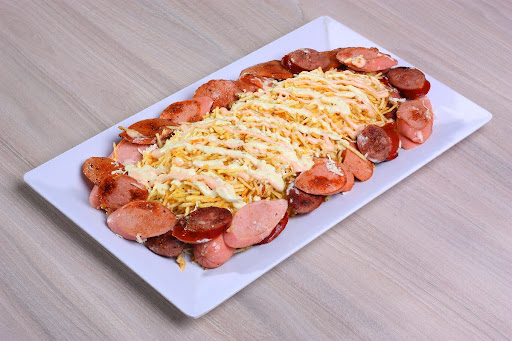 Pan artesanal, salchicha americana, queso costeño, papa chongo, salsa.