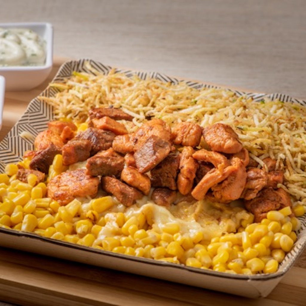 Pollo y carne a la plancha, maíz desgranado, queso costeño, papa chongo.