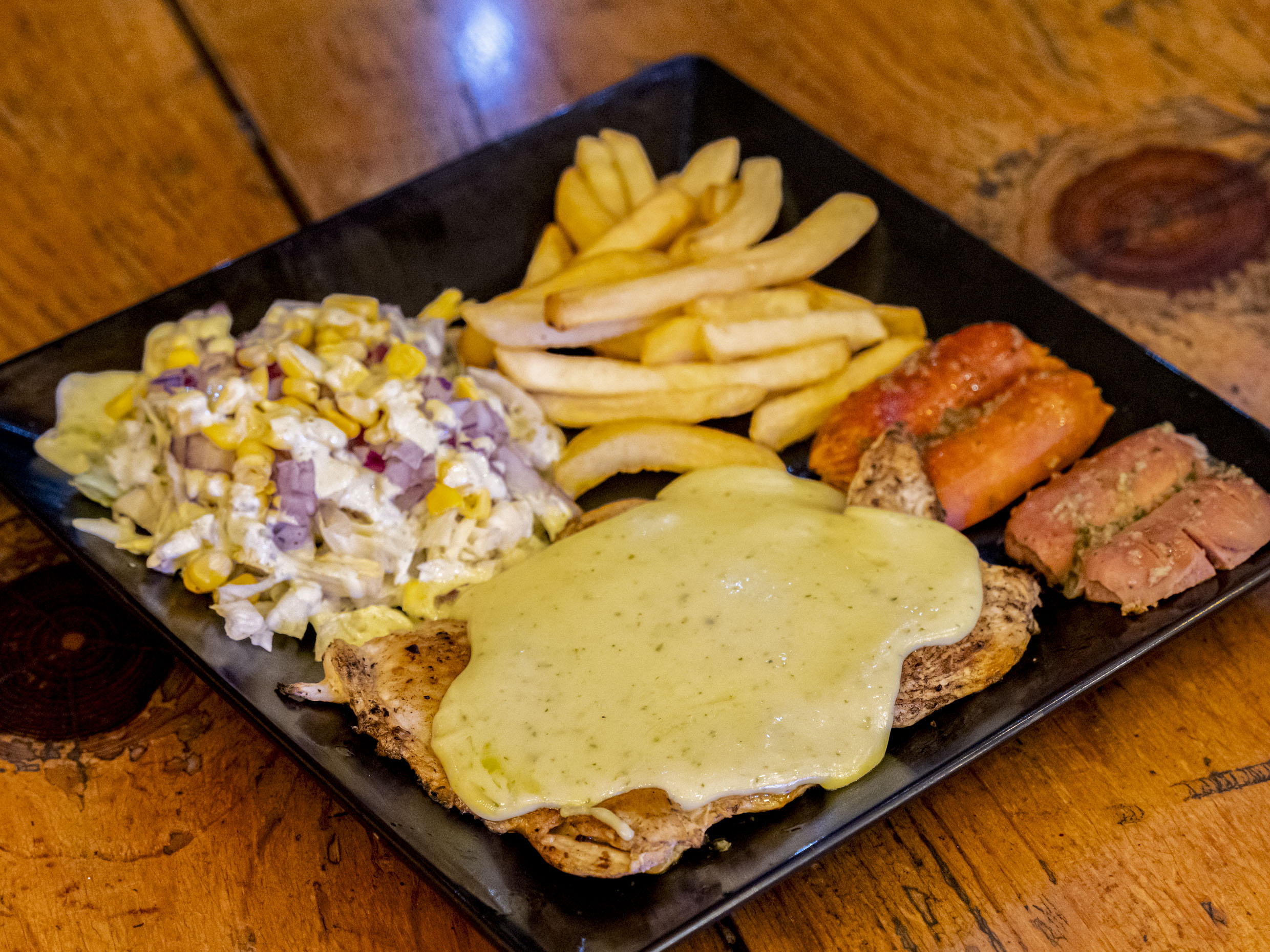 Pechuga gratinada, chorizo, butifarra, papas a la francesa, ensalada (lechuga batavia, tomate, cebolla).