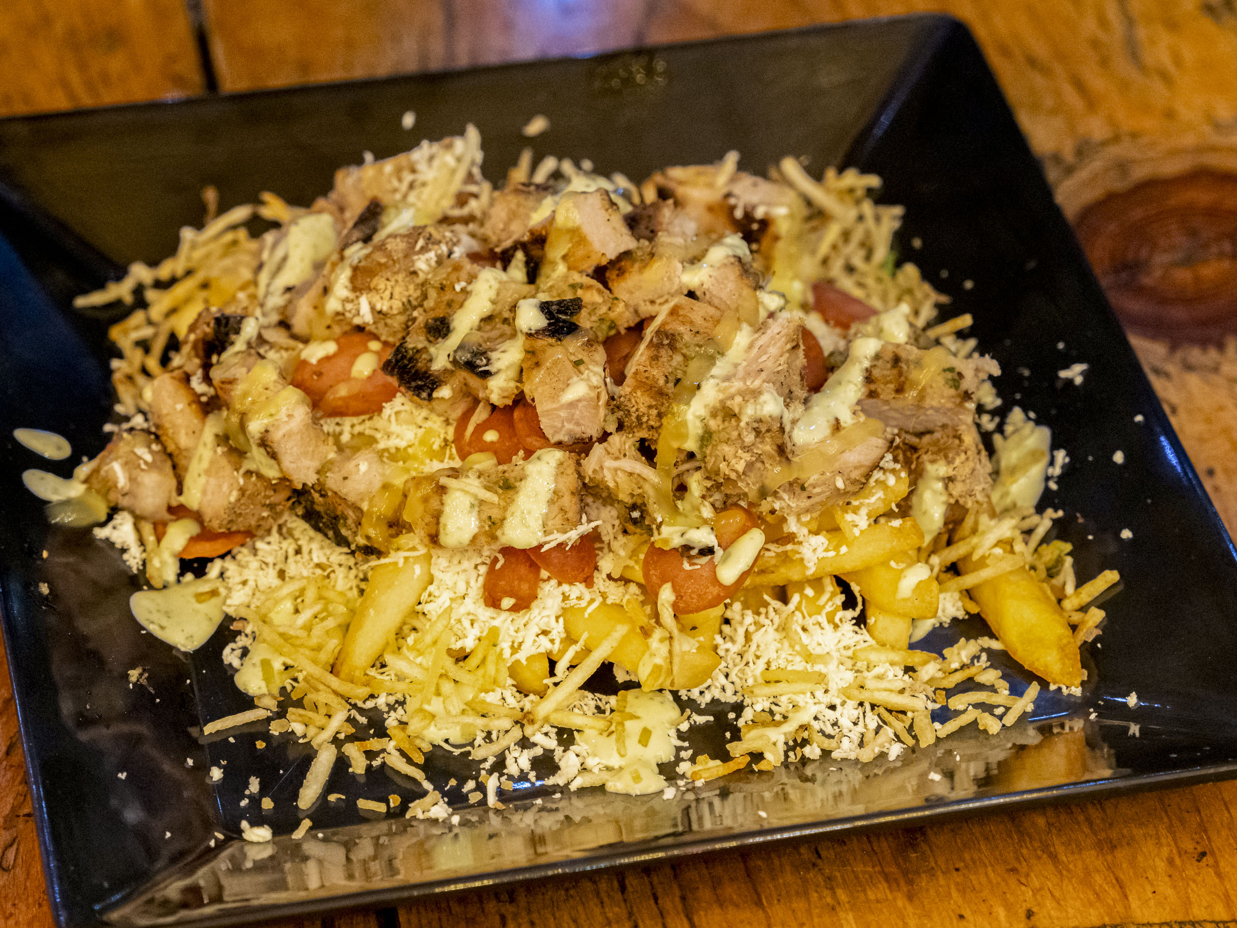 Papas a la francesa, lomito, queso costeño, lechuga batavia, papa chongo.
