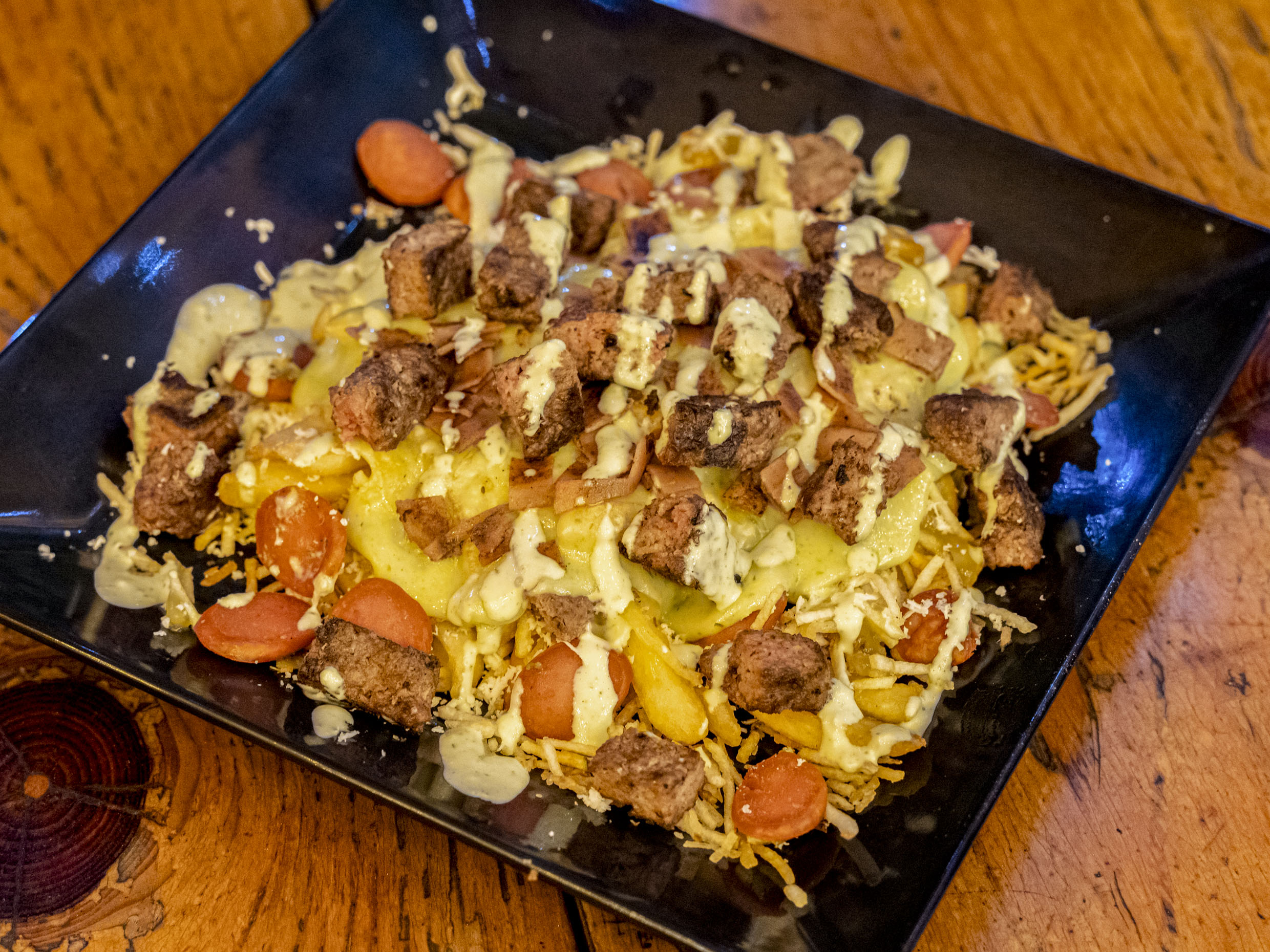 Papas a la francesa, carne de hamburguesa, salchicha, queso mozarella, tocineta, queso costeño, salsas de la casa.
