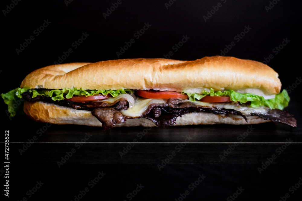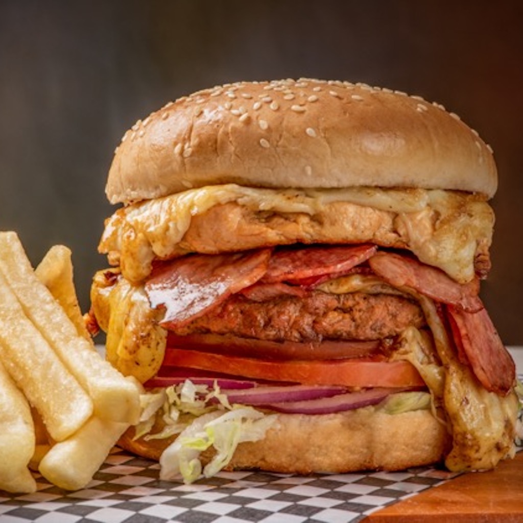 Pan artesanal, pollo, carne angus, queso mozzarella, tomate, lechuga.