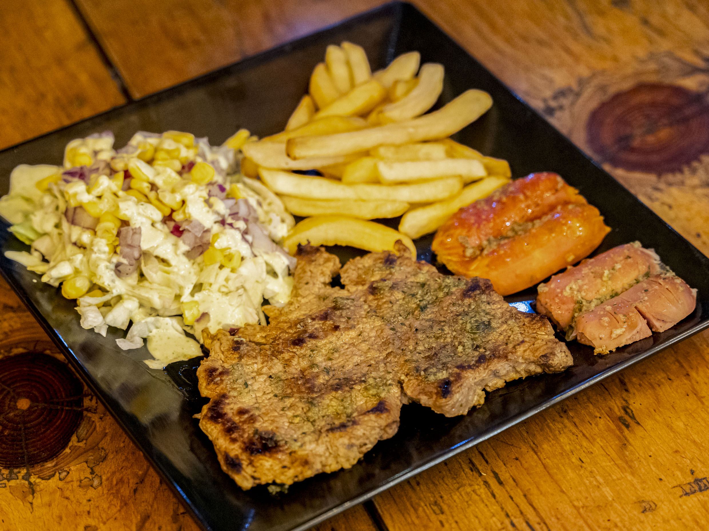 Lomito a la plancha, chorizo, butifarra, papas a la francesa, ensalada (lechuga batavia, tomate, cebolla).