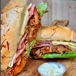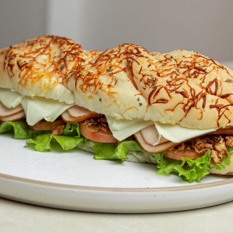 Pan artesanal mediterráneo, jamon de pavo, queso mozarella, vegetalesy cebolla crunchy caramelizada