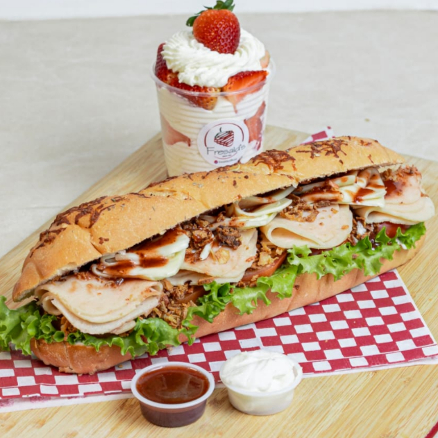 Sandwich de 30 cm de jamon ahumado + Fresas con crema 9 Onzas + Batido de fresa 16 Oz