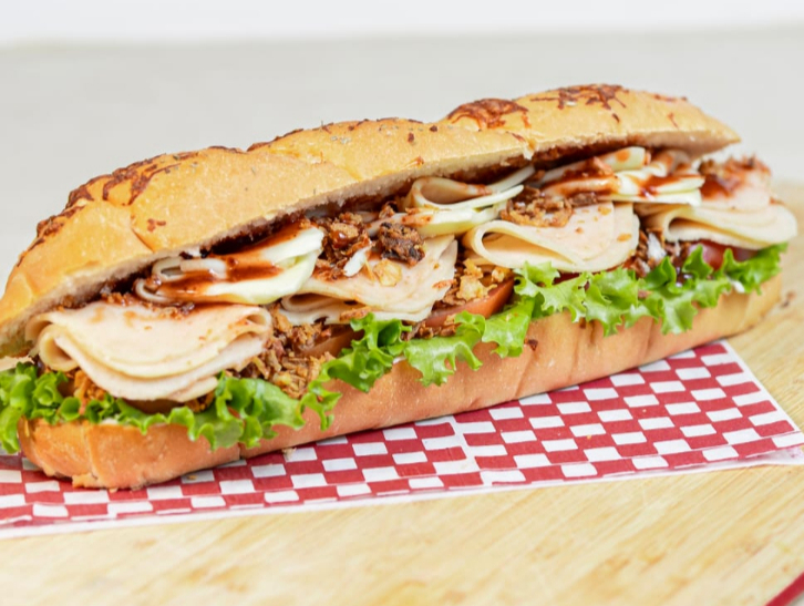 Pan artesanal , pavo ahumado, queso mozarella, cebolla crunchy, vegetales frescos y salsa agridulce de fresa
