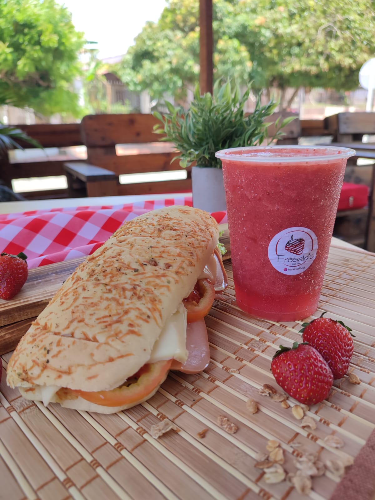 1 Sándwich Jamón, queso , vegetales frescos con cbolla crunchy caramelizada + 1 Fresas con Crema 9Onz.