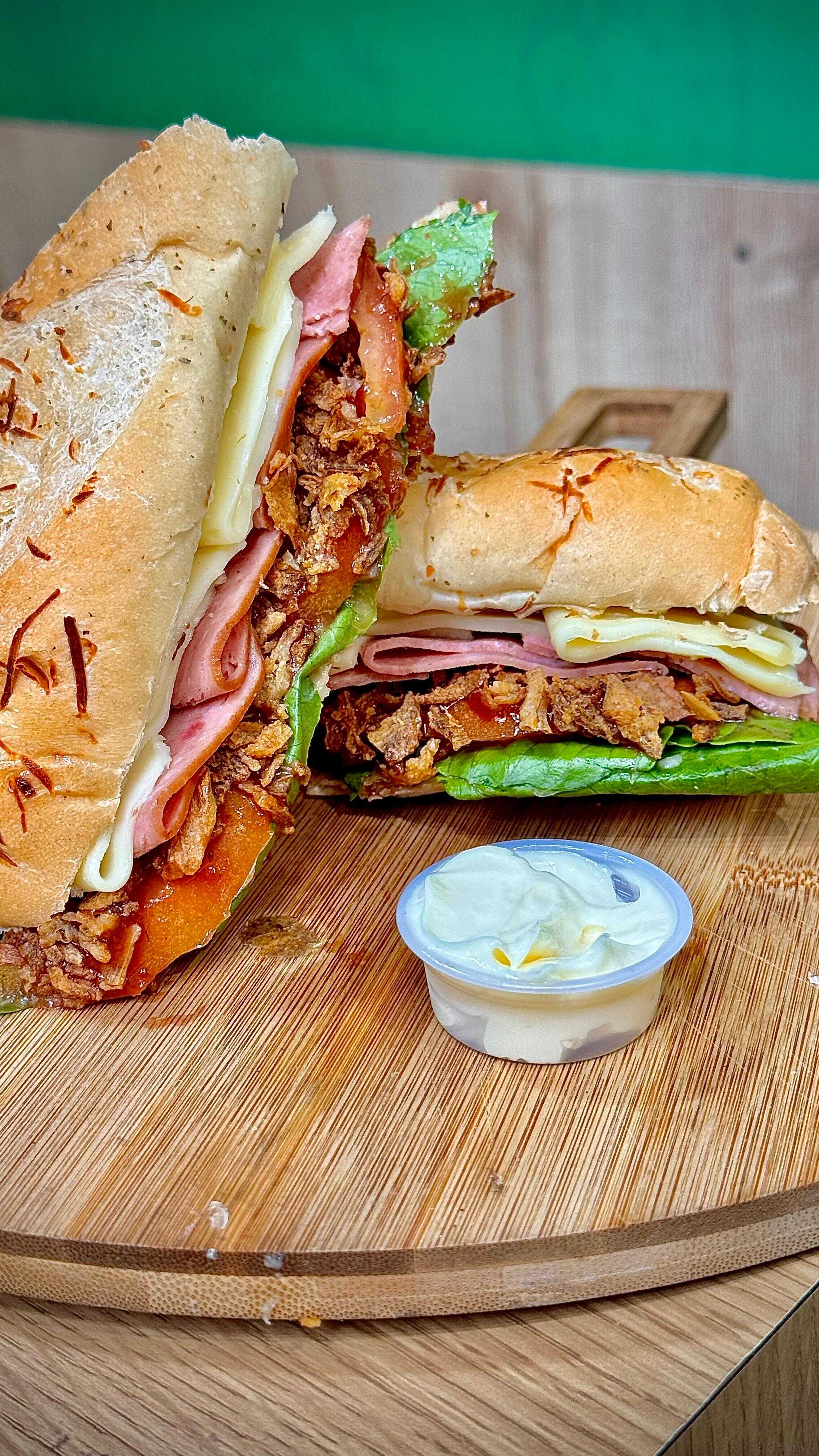 Pan artesanal mediterráneo, jamon de pavo, queso mozarella, vegetalesy cebolla crunchy caramelizada