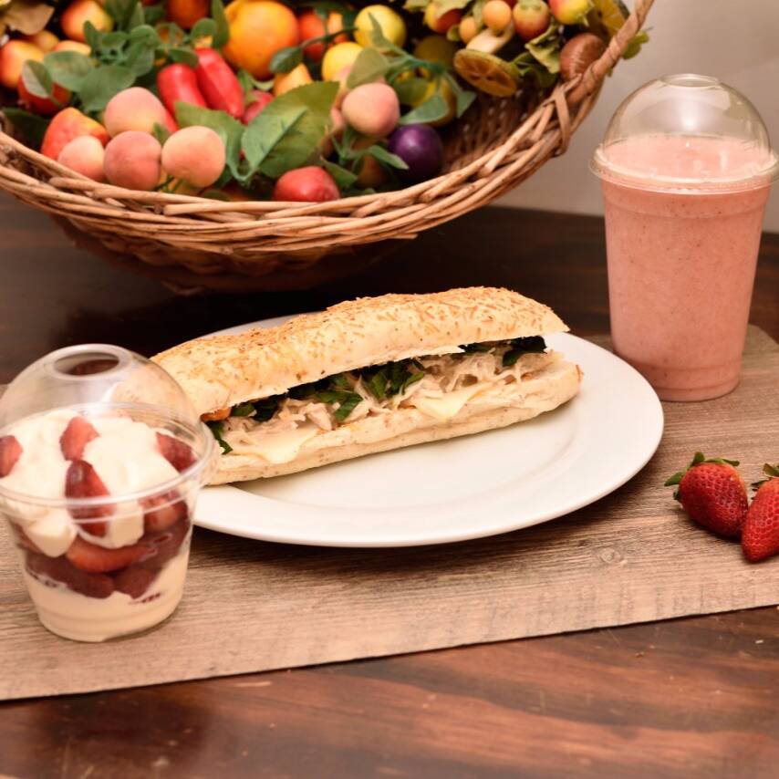 Combo Sándwich Jamón Grande (Pan artesanal mediterráneo 22 cm, vegetales, salsas de la casa) + Batido de Fresa 12 Oz