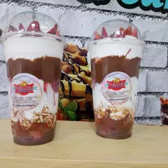 vaso de12 onzas de fresas con crema de la casa , trozos de brownie .