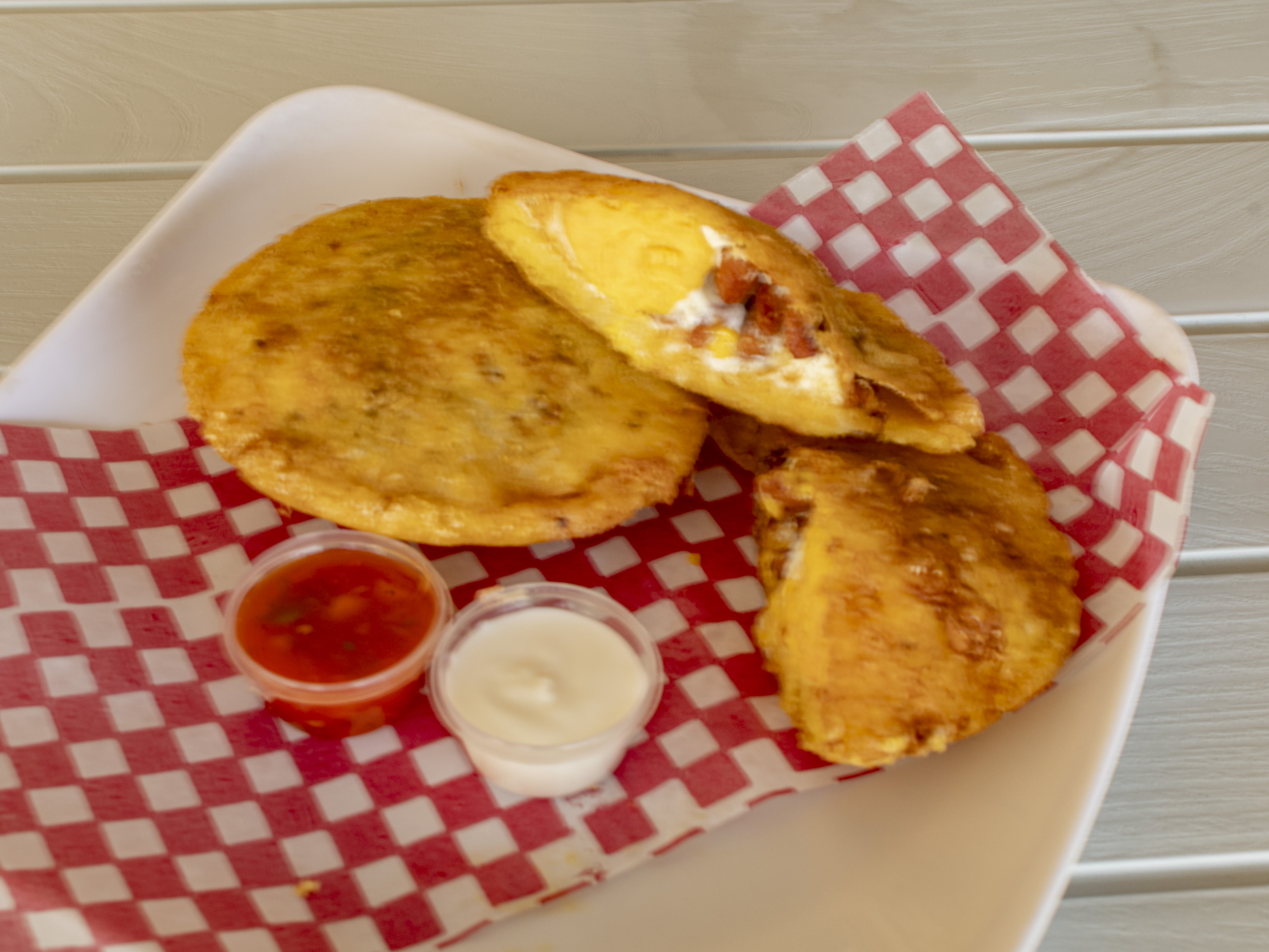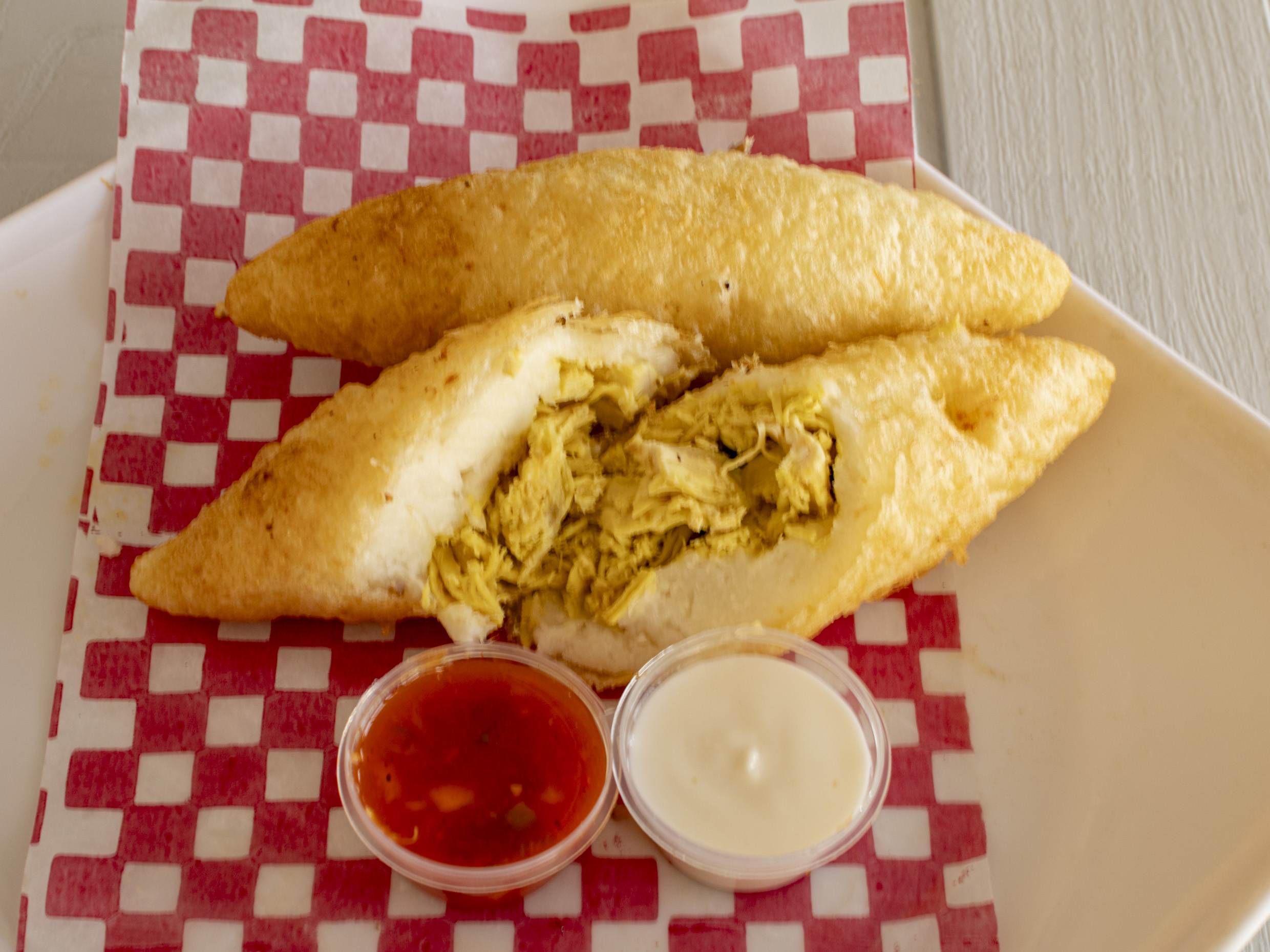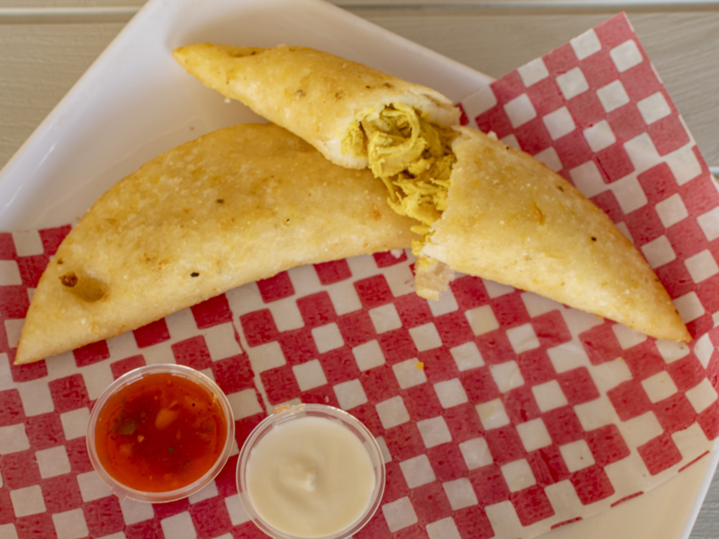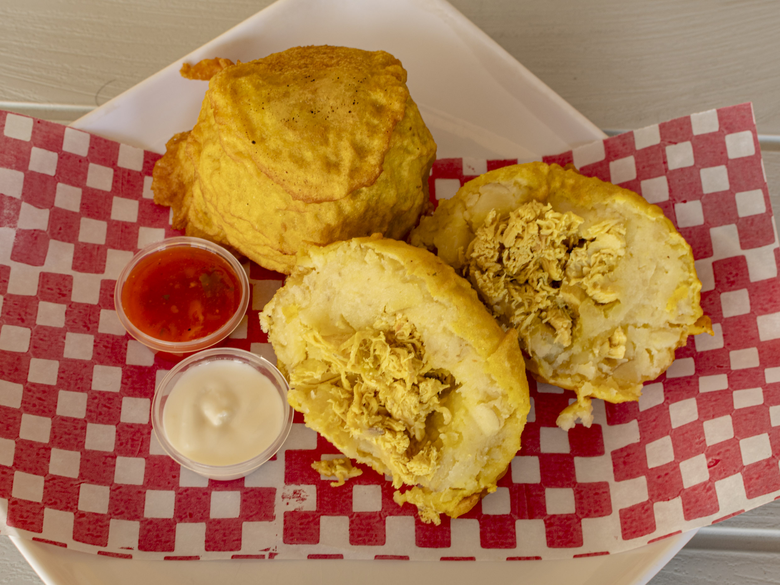 Masa de maíz blanca o Amarilla frita rellena con Pechuga de Pollo acompañada con Salsa de la casa. (1 Pieza).