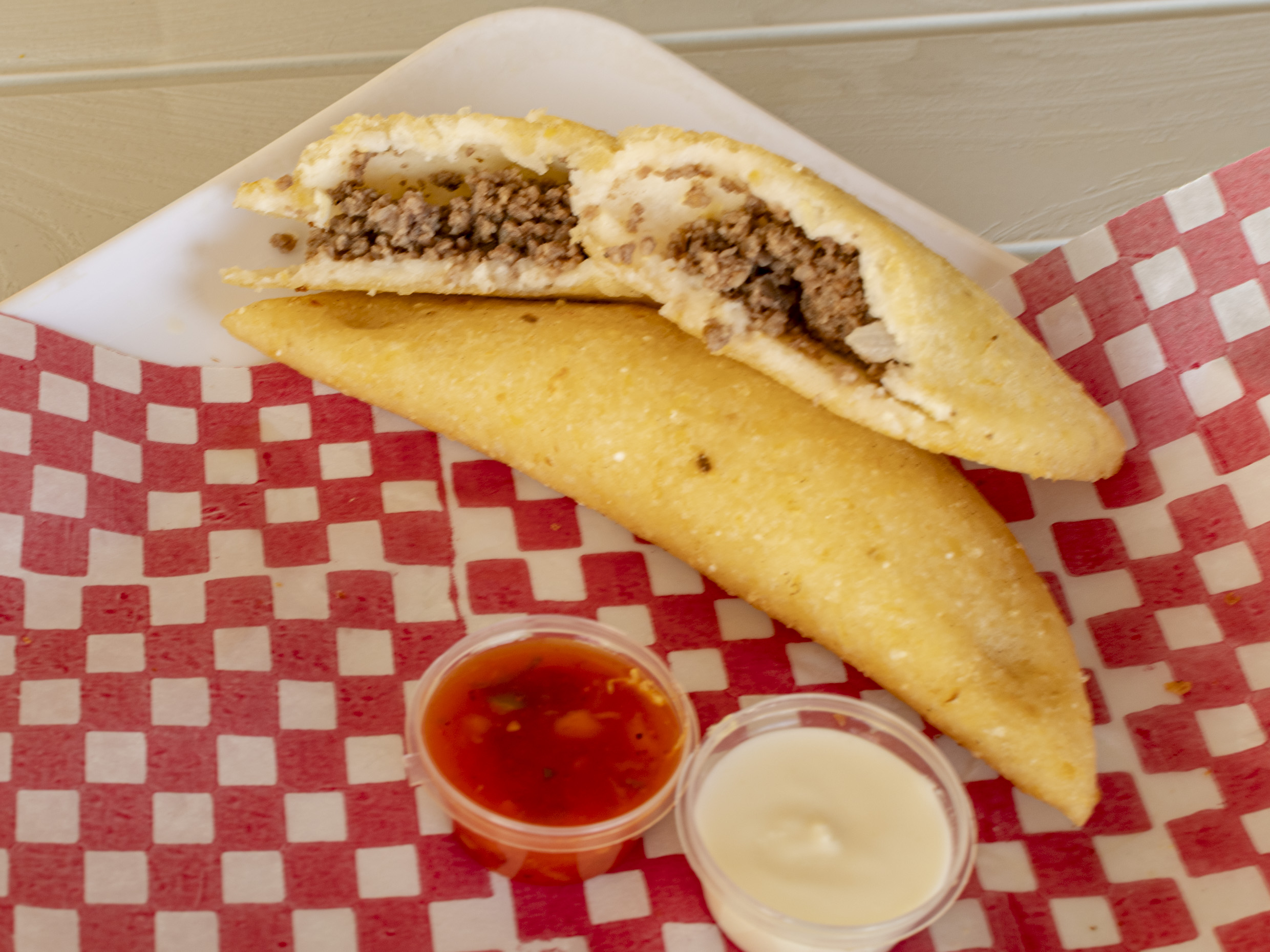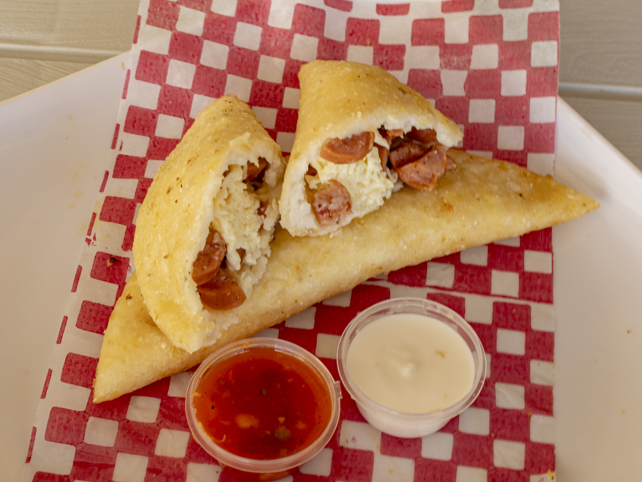 Masa de maíz blanca o amarilla frita rellena con queso costeño y salchicha ranchera