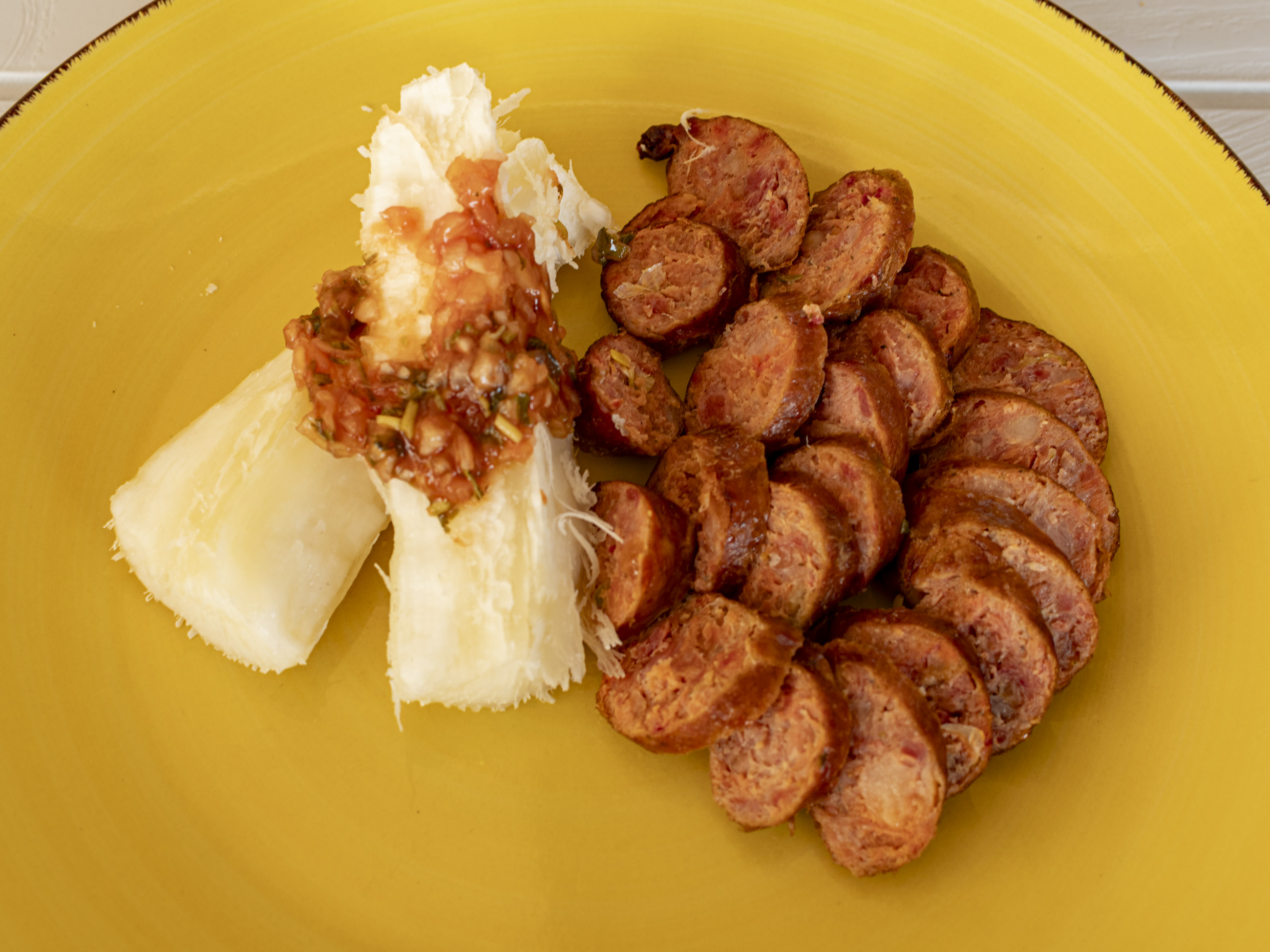 120 gm de chorizo de cerdo acompañado de yuca o bollo blanco.