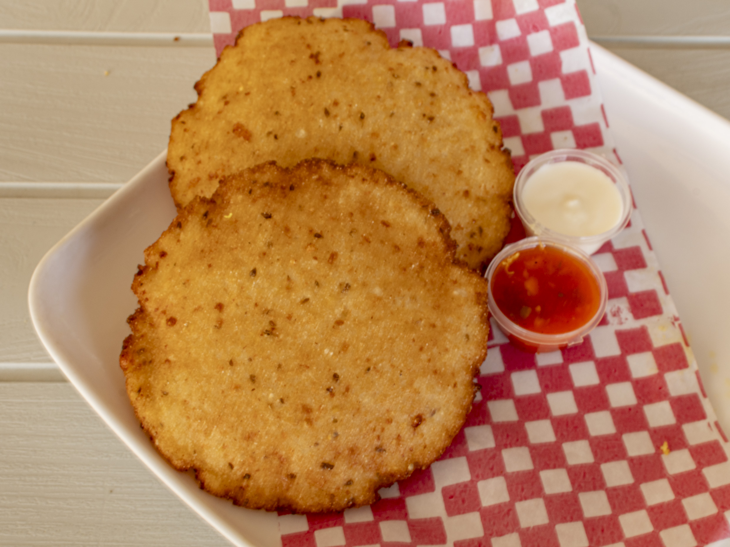 Masa de maíz blanca o amarilla frita rellena de queso costeño y chorizo