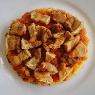 Se cortan las salchichas (tipo frankfurt o vienesa) en rodajas. Se sofríen en una sartén junto con un picadillo de tomate, cebolla.